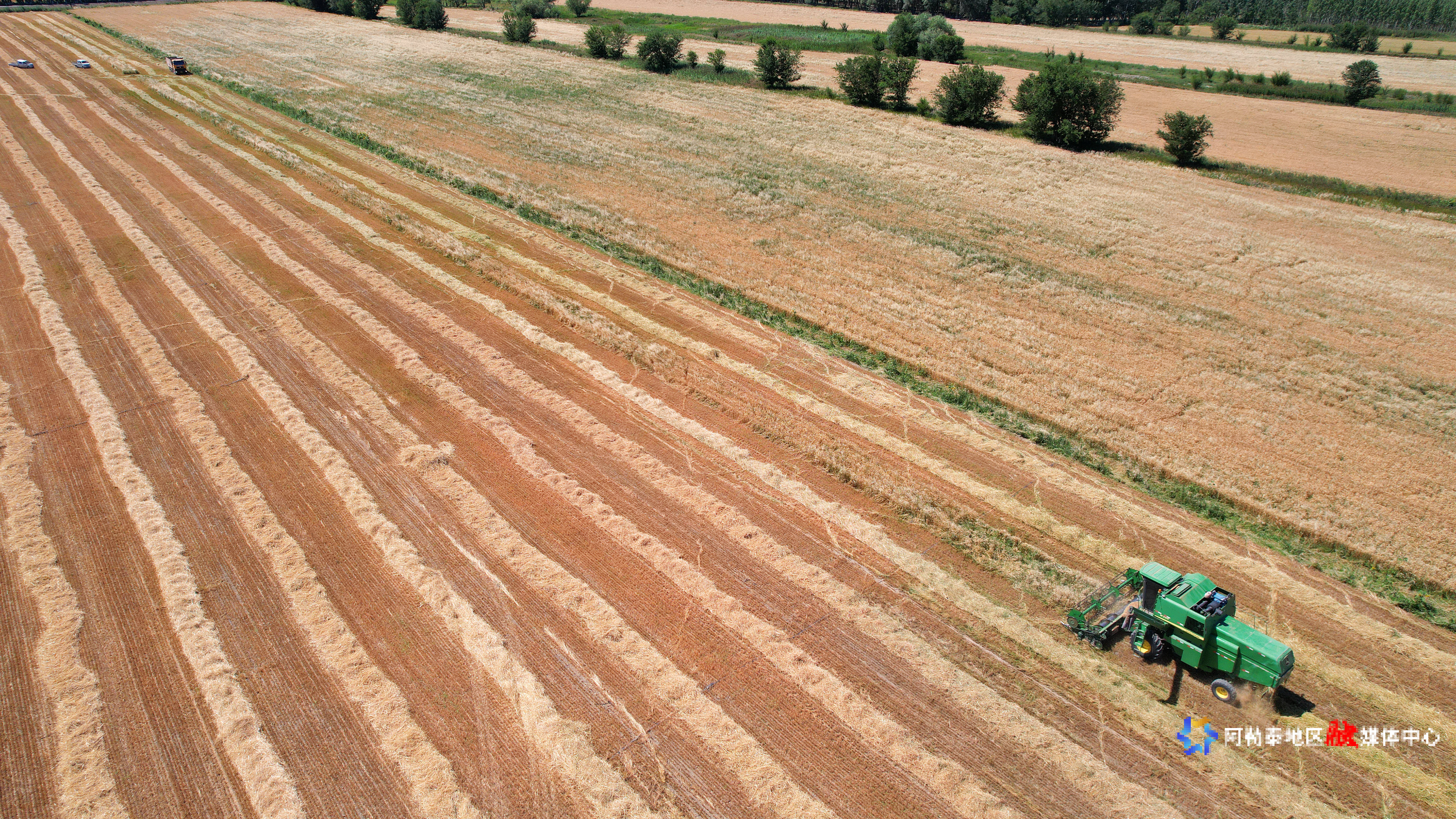 2025年8月5日,吉木乃县恰勒什海乡农户驾驶农机收割小麦(无人机拍摄)。记者 阿尔达克·拜斯汗 摄