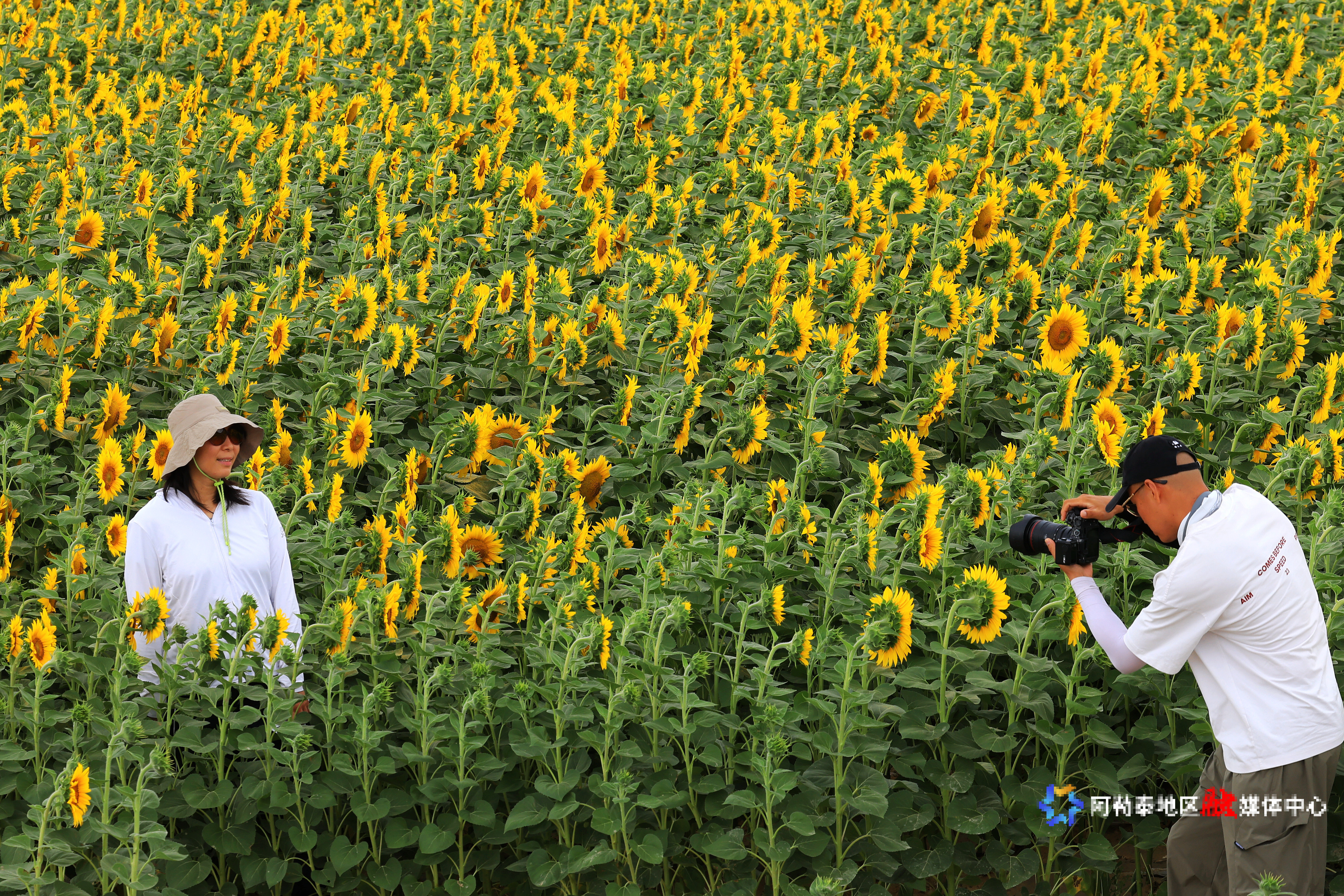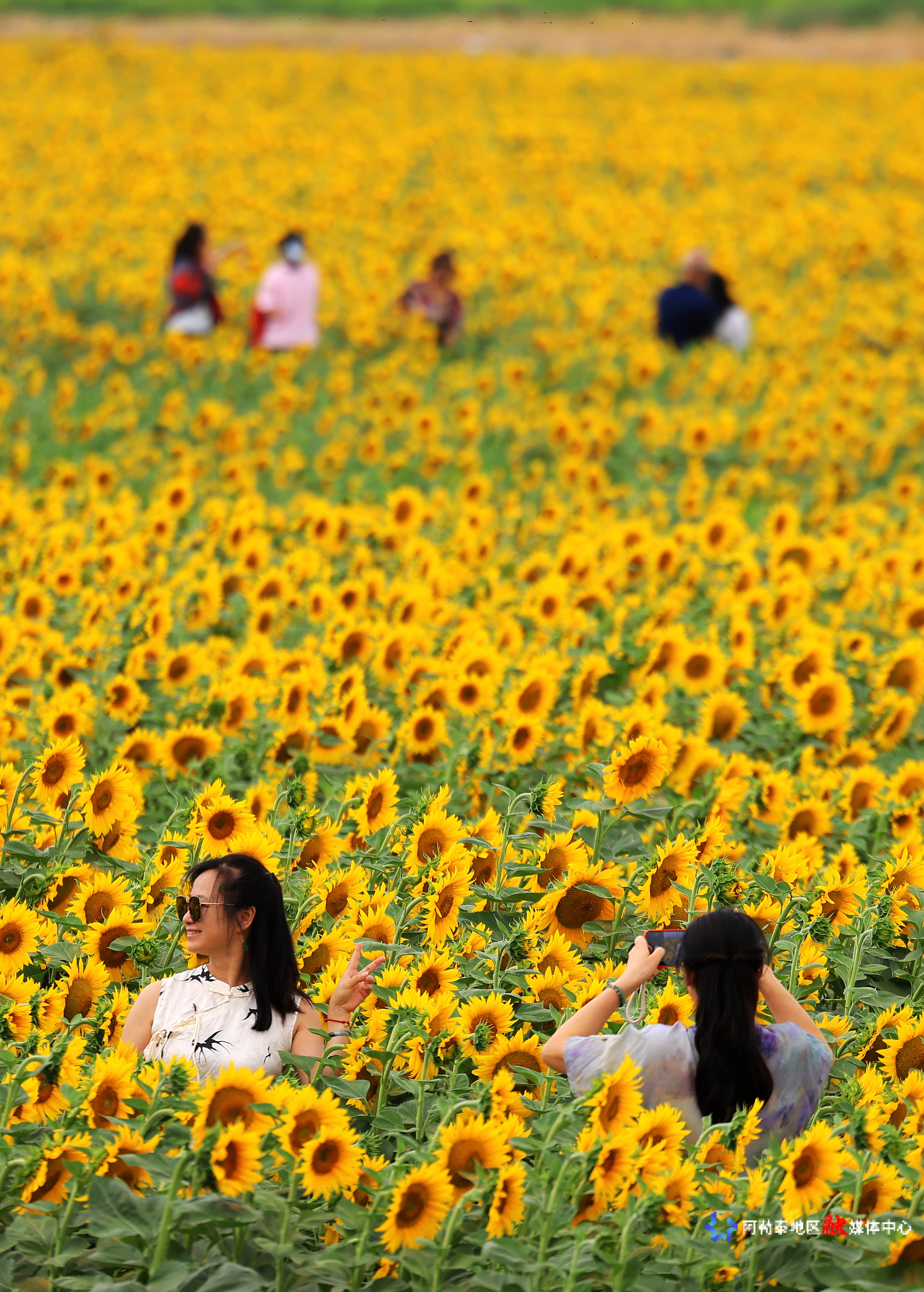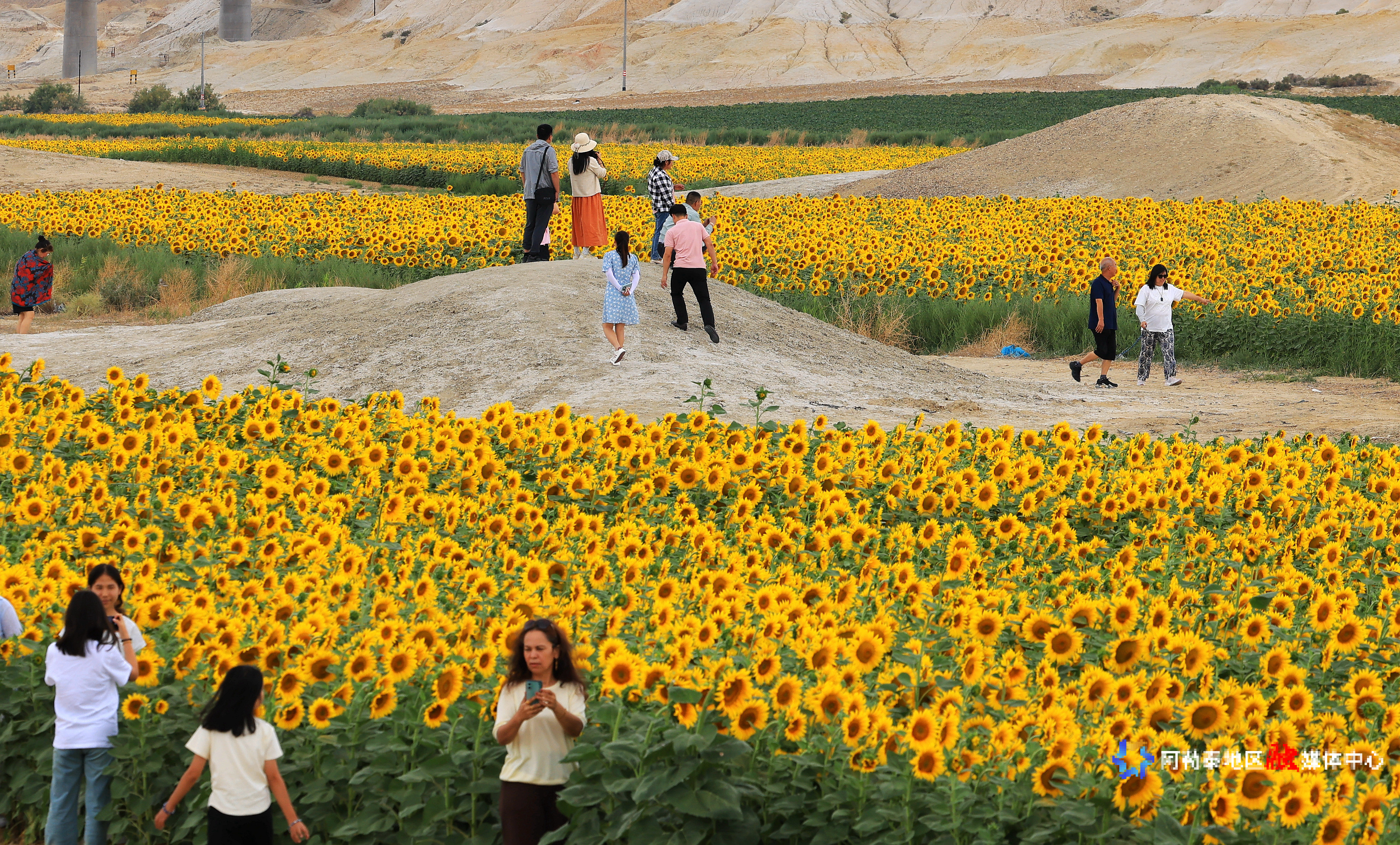 8月3日,福海县解特阿热勒镇大片向日葵花进入观赏期,吸引游客前来打卡游玩、拍照留念。记者 阿尔达克·拜斯汗 摄