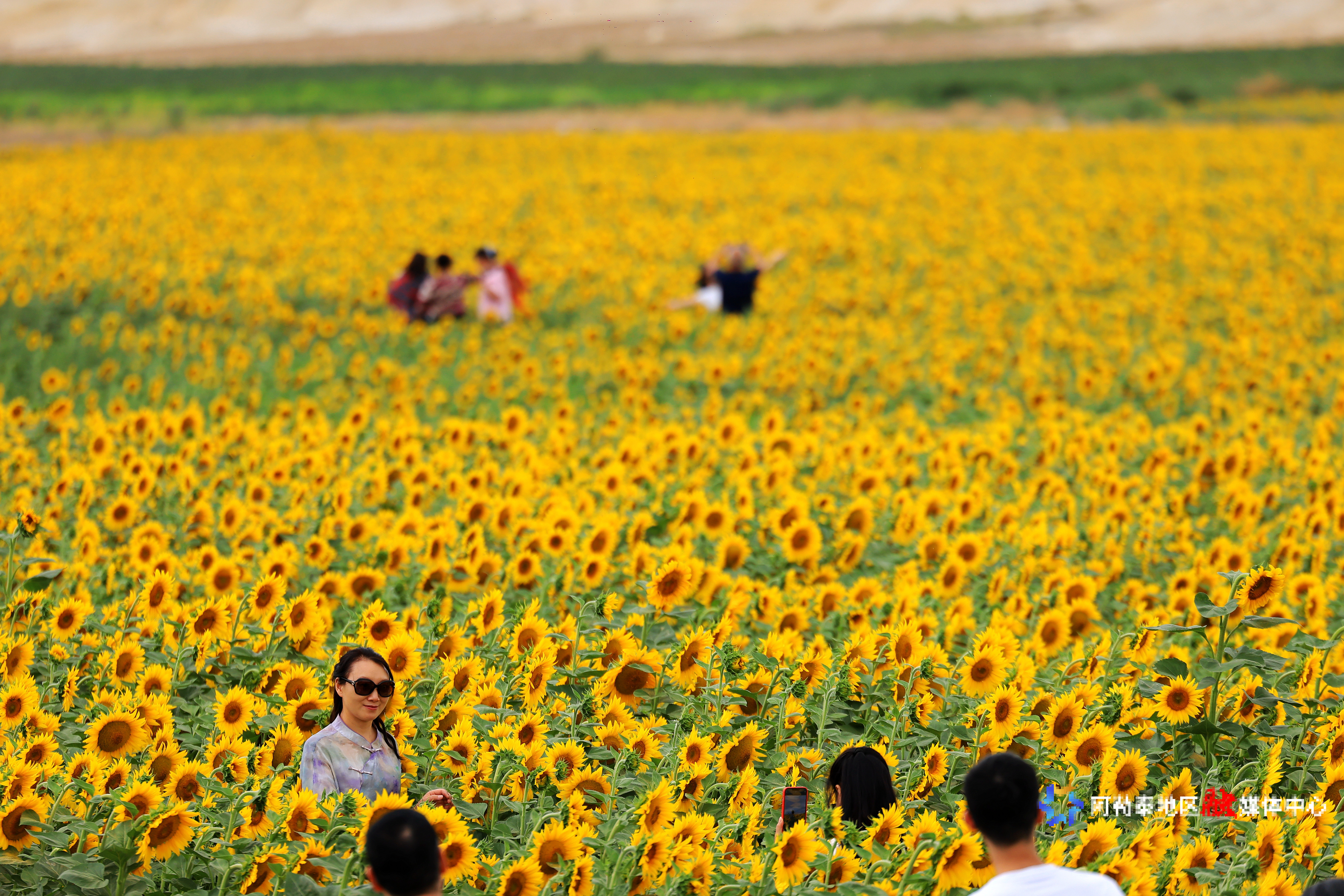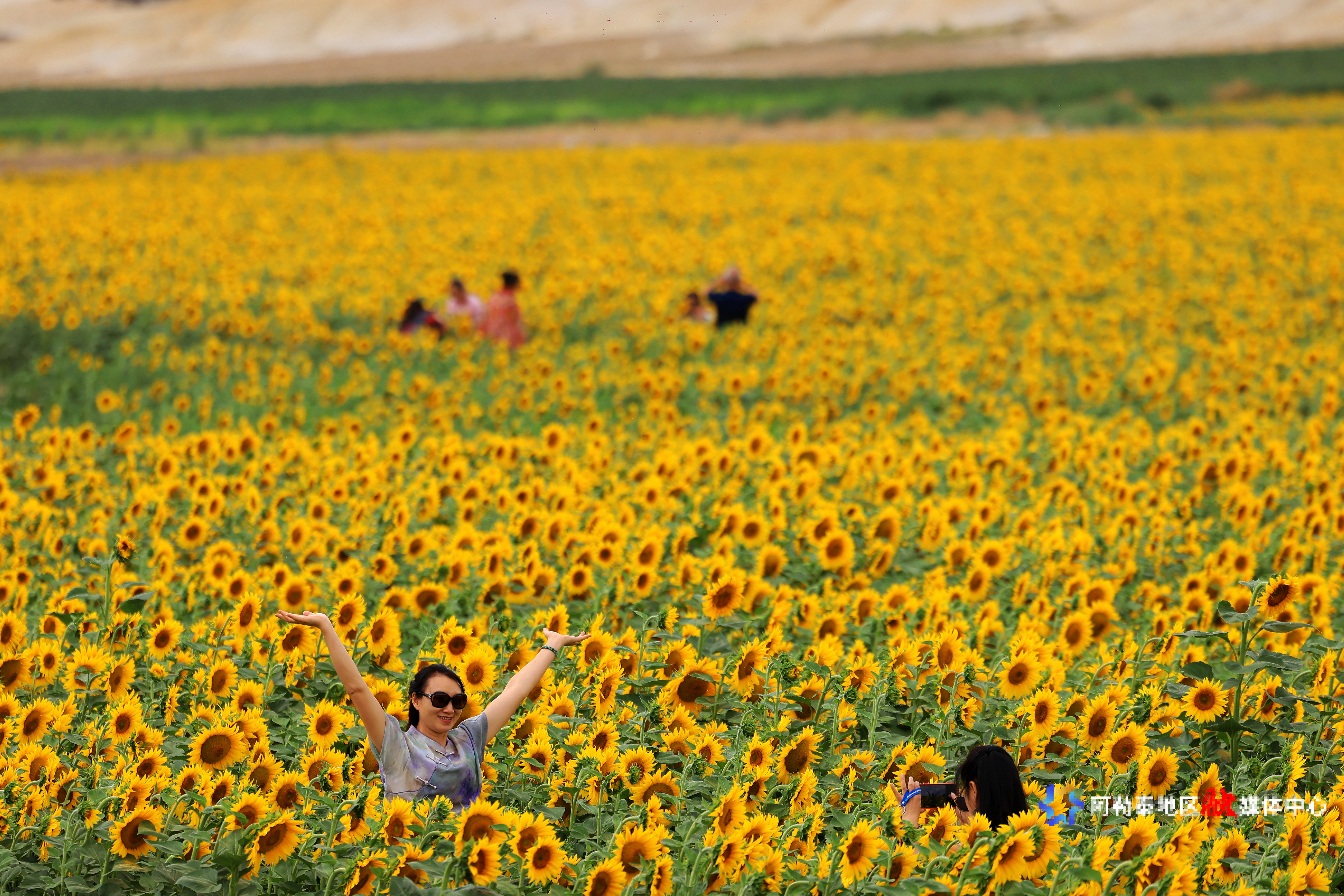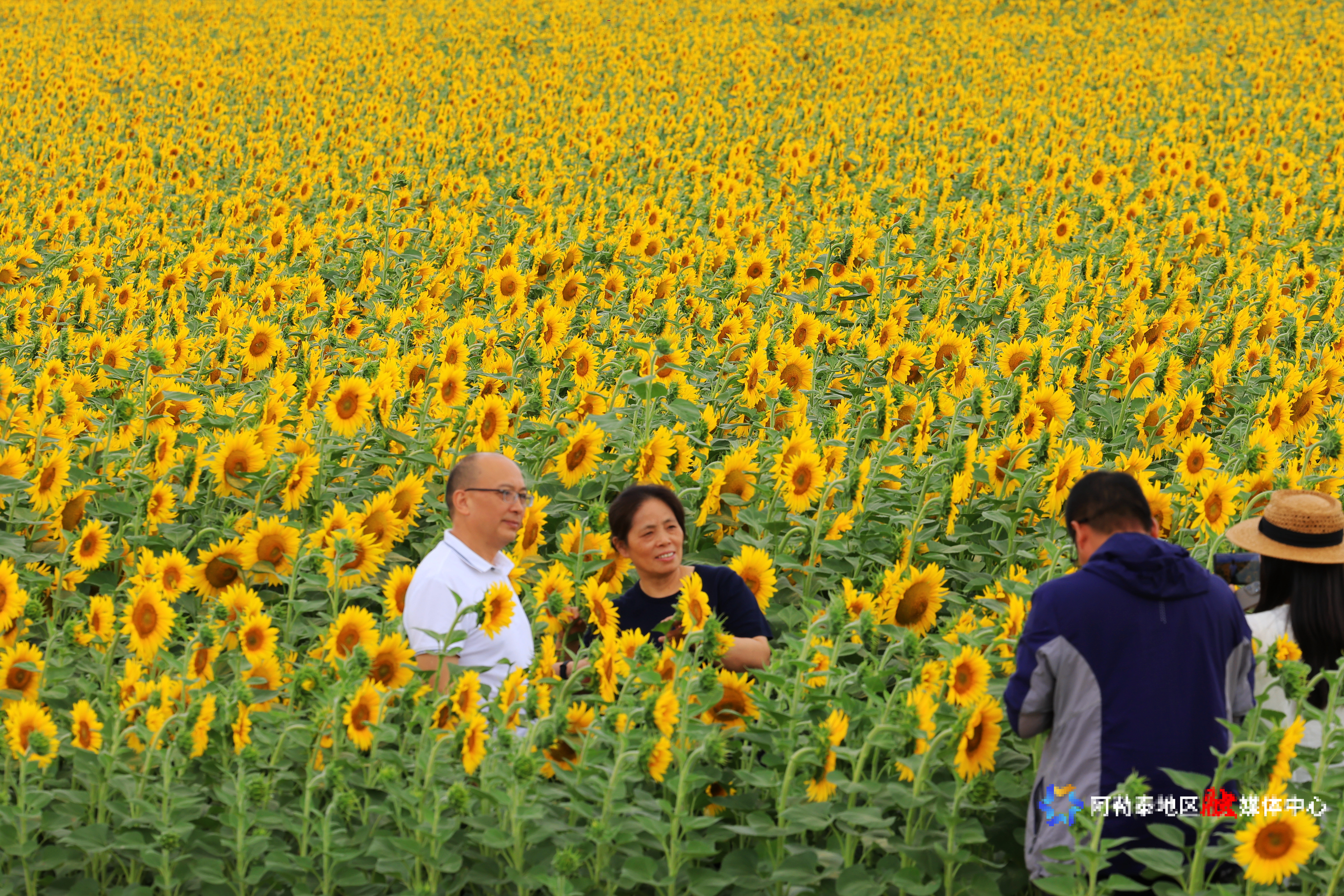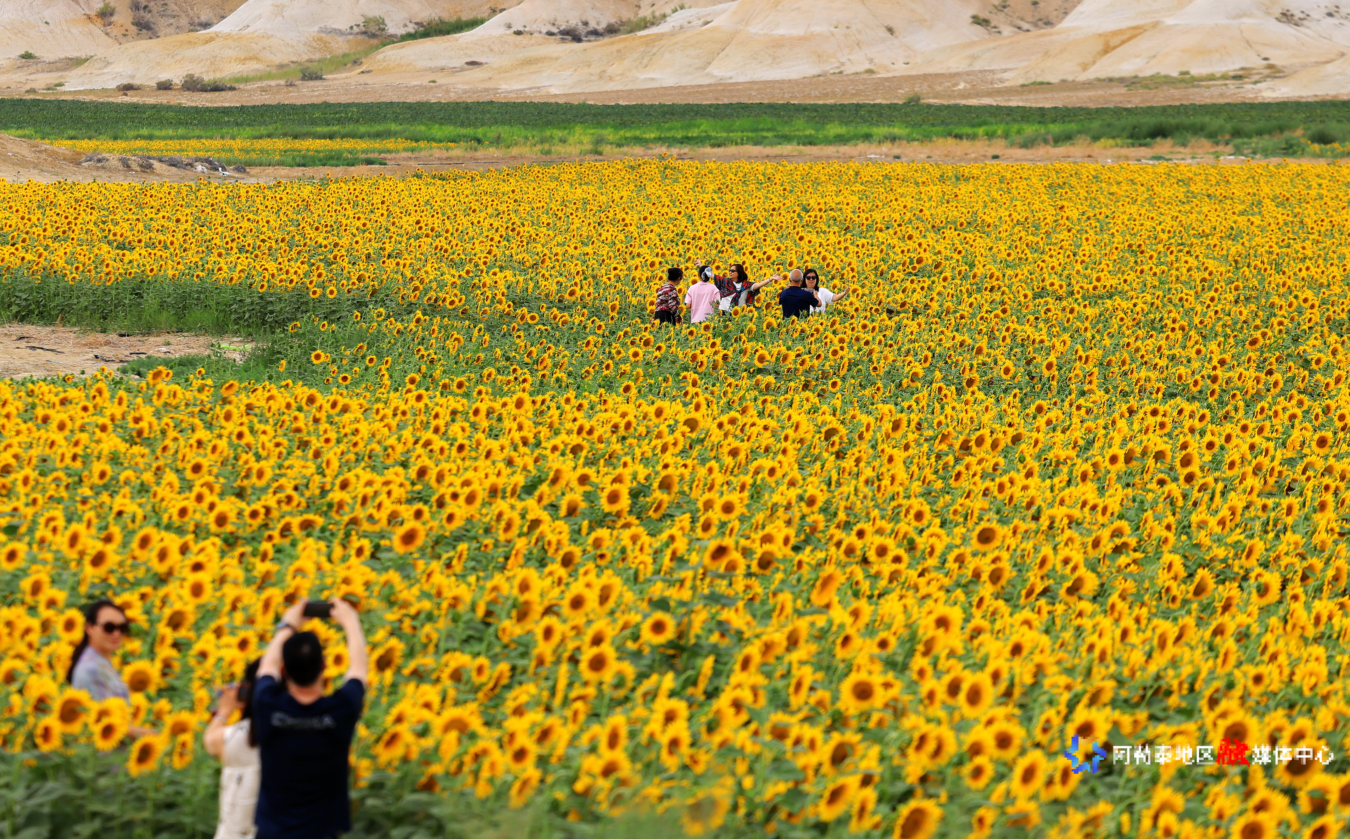 8月3日,福海县解特阿热勒镇大片向日葵花进入观赏期,吸引游客前来打卡游玩、拍照留念。记者 阿尔达克·拜斯汗 摄