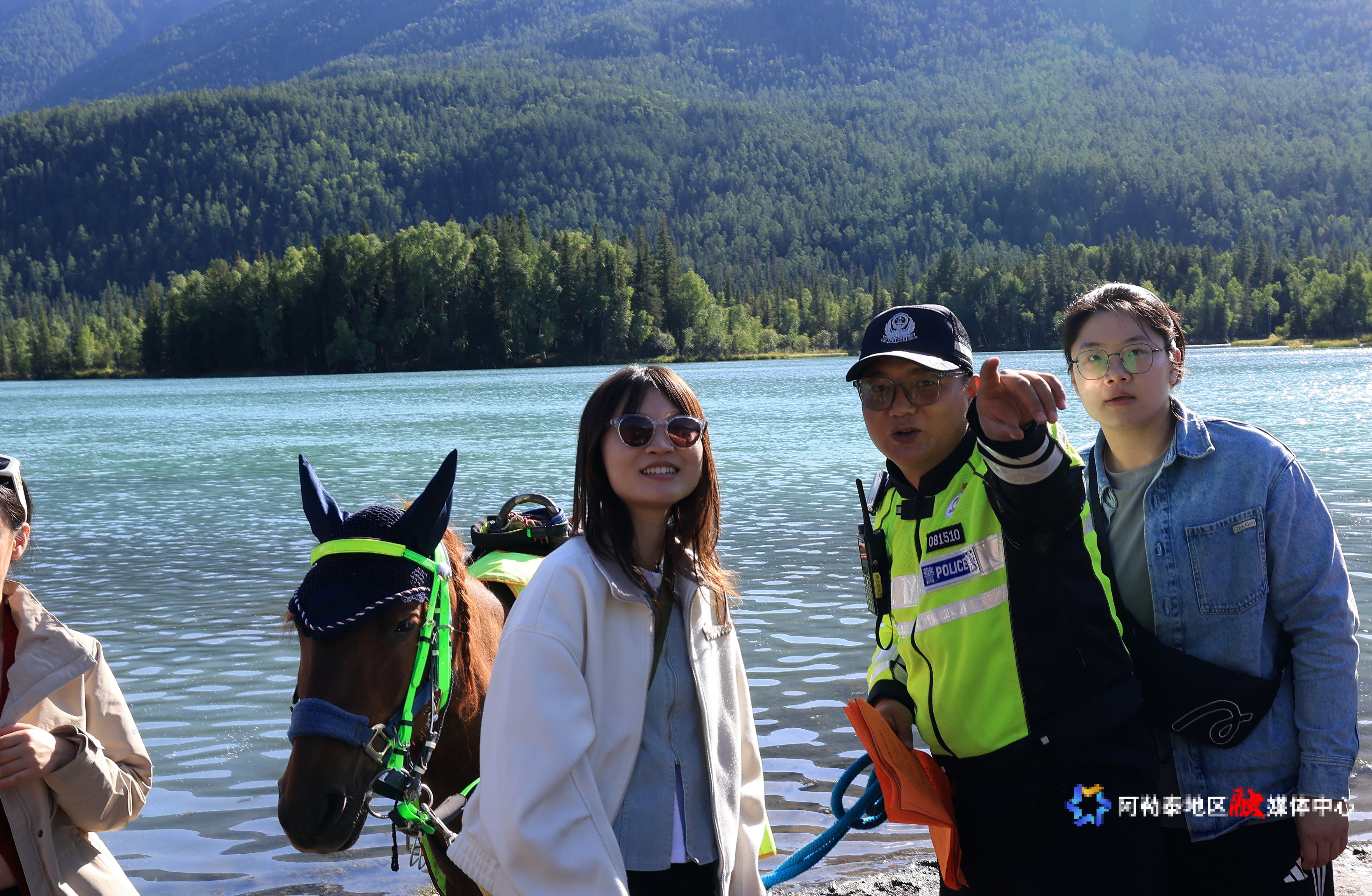 2025年8月16日,喀纳斯公安局骑警们在喀纳斯景区跟游客互动。记者 阿尔达克·拜斯汗 摄