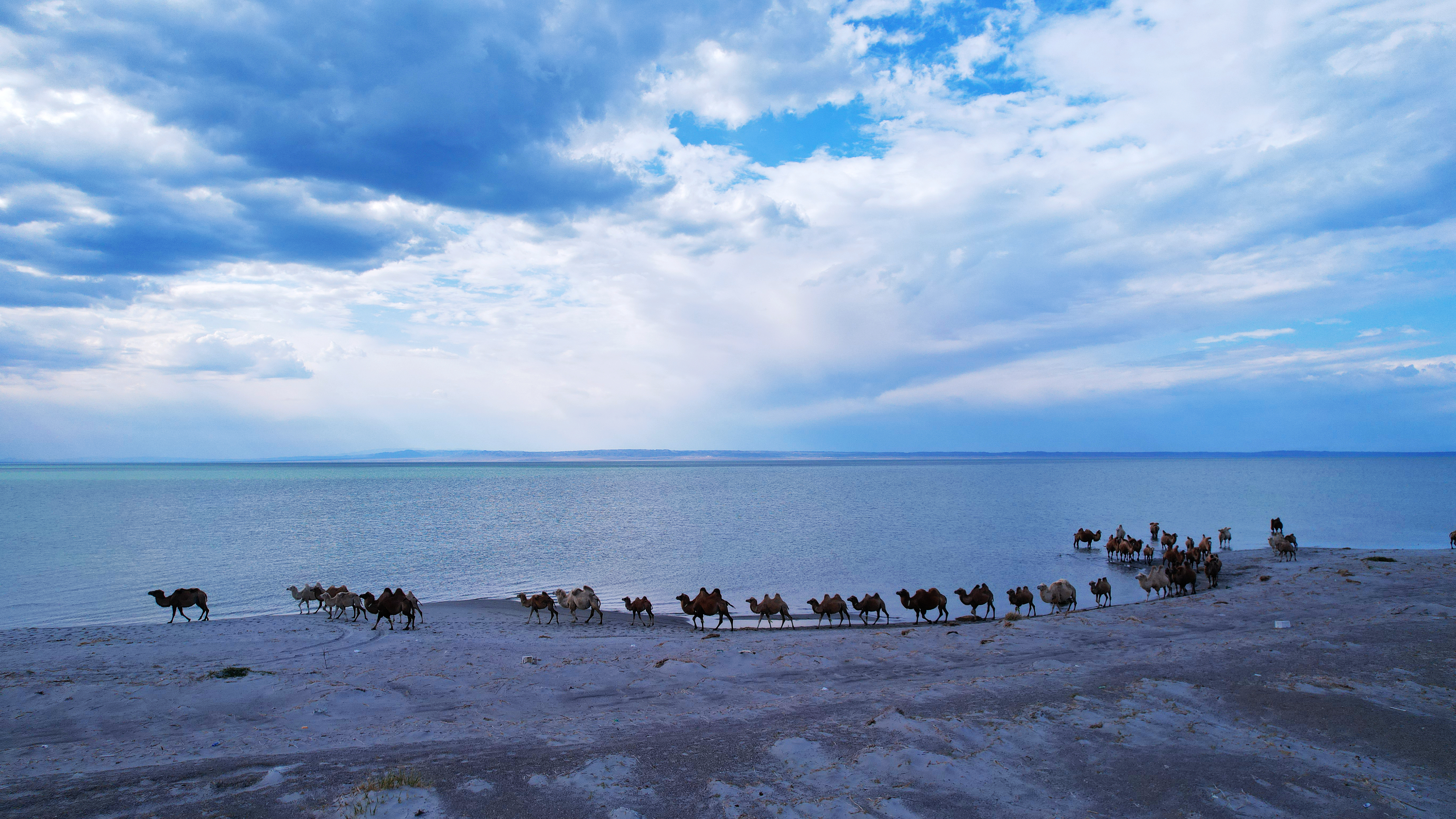 阿勒泰新闻网-阿勒泰地区融媒体中心(记者 阿尔达克·拜斯汗) 8月25日,在乌伦古湖畔,一群骆驼悠然饮水休憩。它们高大的身影与波光粼粼的湖面构成了一幅静谧而壮美的生态画卷。