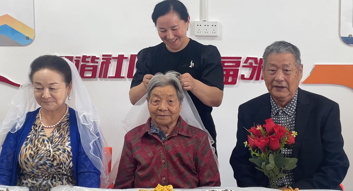 活动中,社区还举办“邻里话家常”茶话会,大家围坐在一起,共品茶香、共享美食、共话家常,互相分享邻里故事。并穿插“绣球传递”“心有灵犀”等趣味温情的小游戏。最温馨的,莫过于社区工作人员提前准备了洁白头纱和鲜花花束,引导老人们互相整理仪容,帮助老人们拍摄“银发婚纱照”,留存美好瞬间。