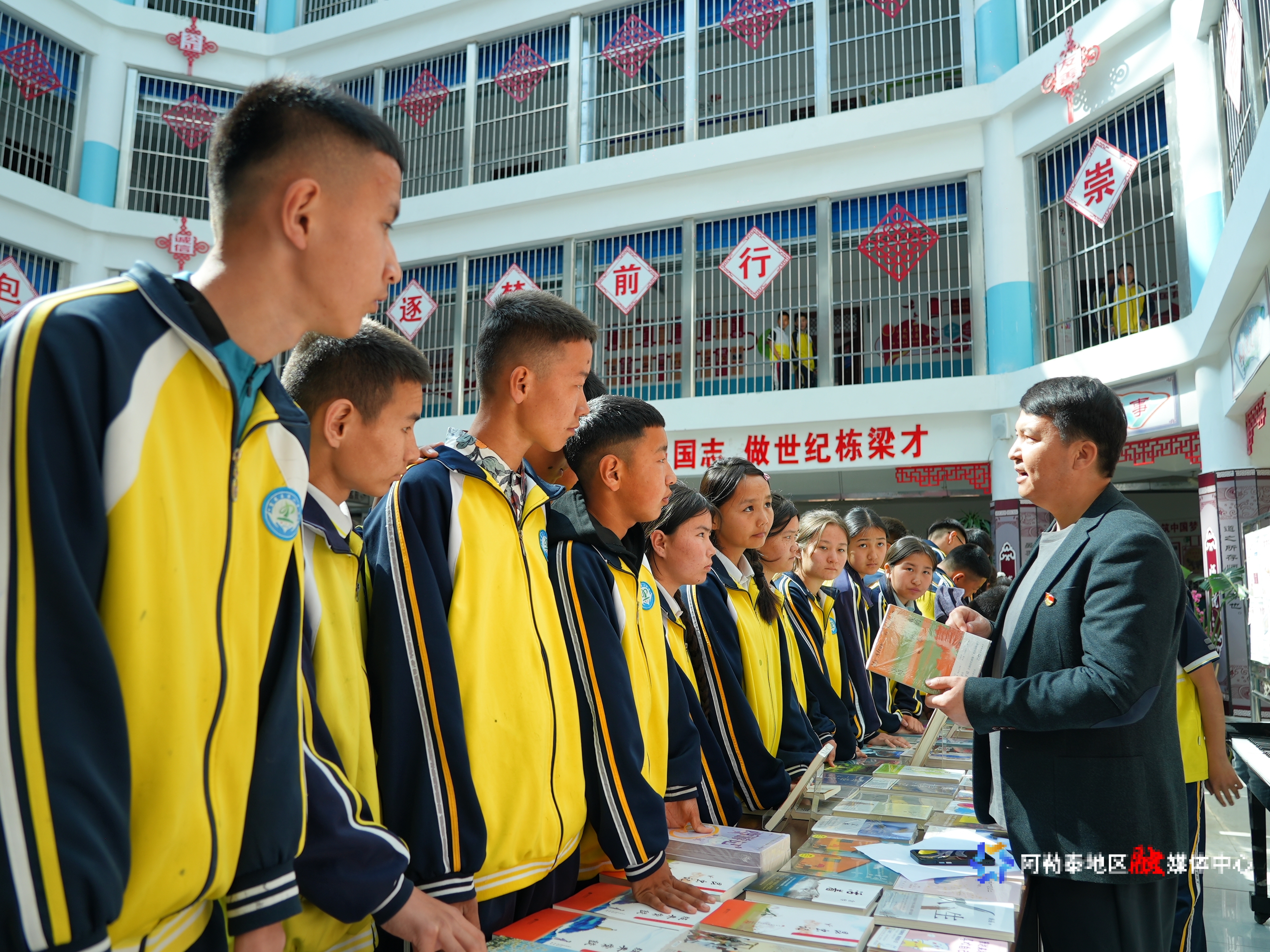 富蕴县第二中学老师正与初中学生开展“共读小时光”活动。