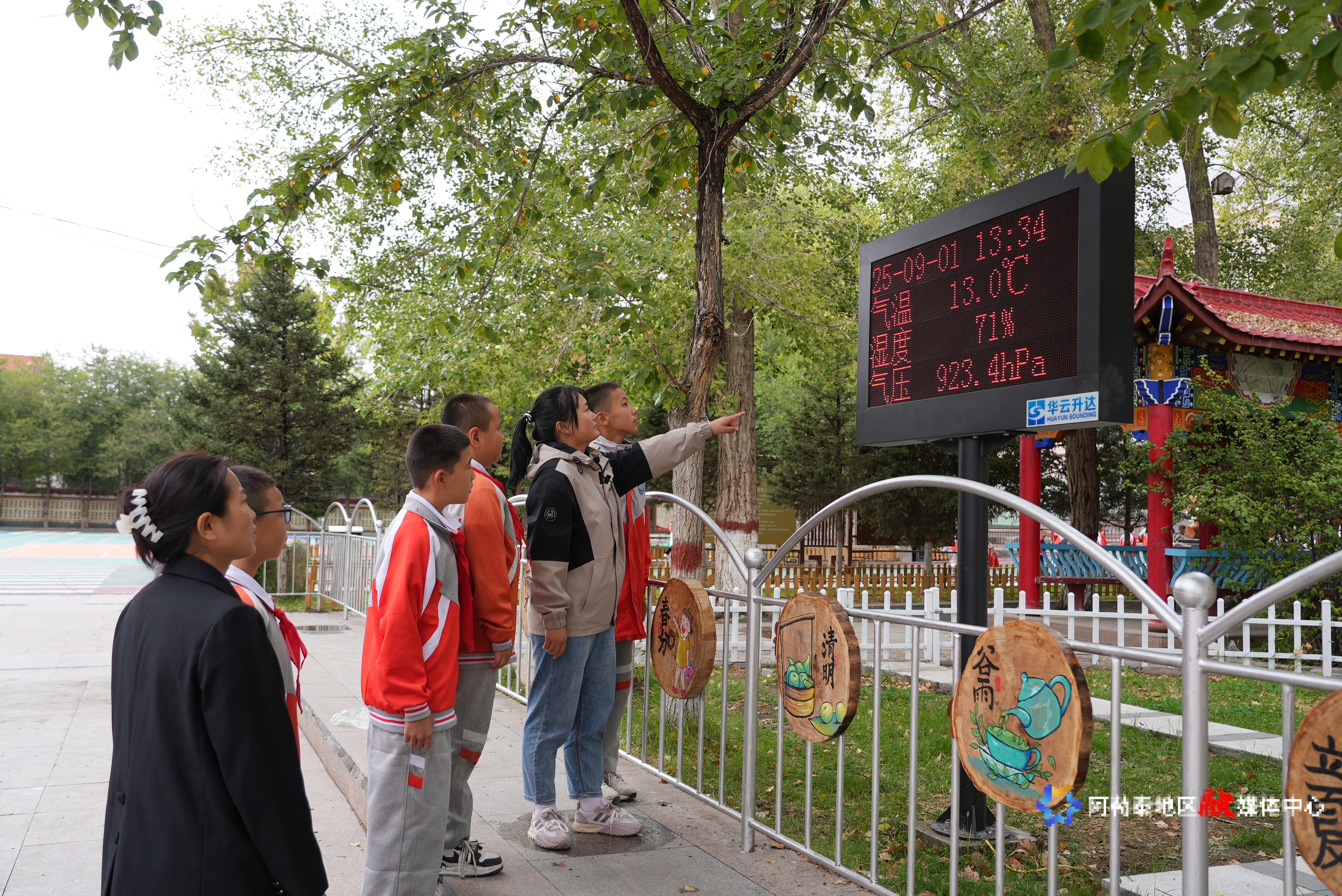 富蕴县第一小学老师向学生讲解气象科普知识。