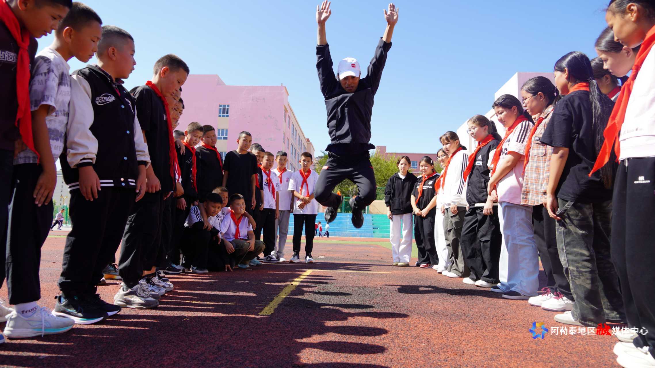 阿勒泰市第一中学体育老师给学生示范训练技巧。