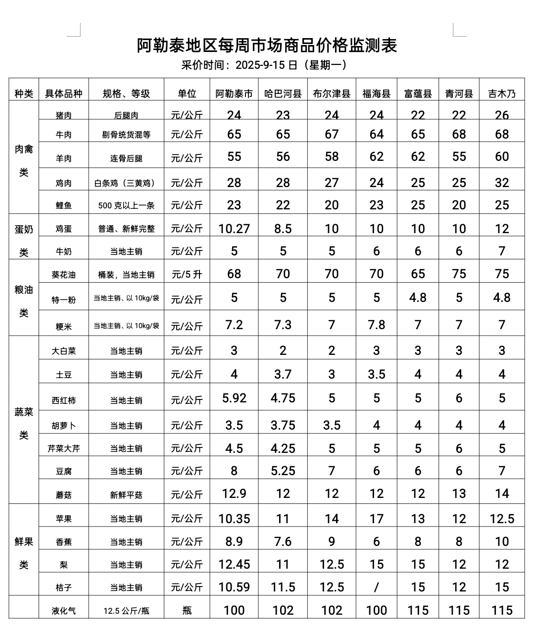 阿勒泰地区每周市场商品价格监测表