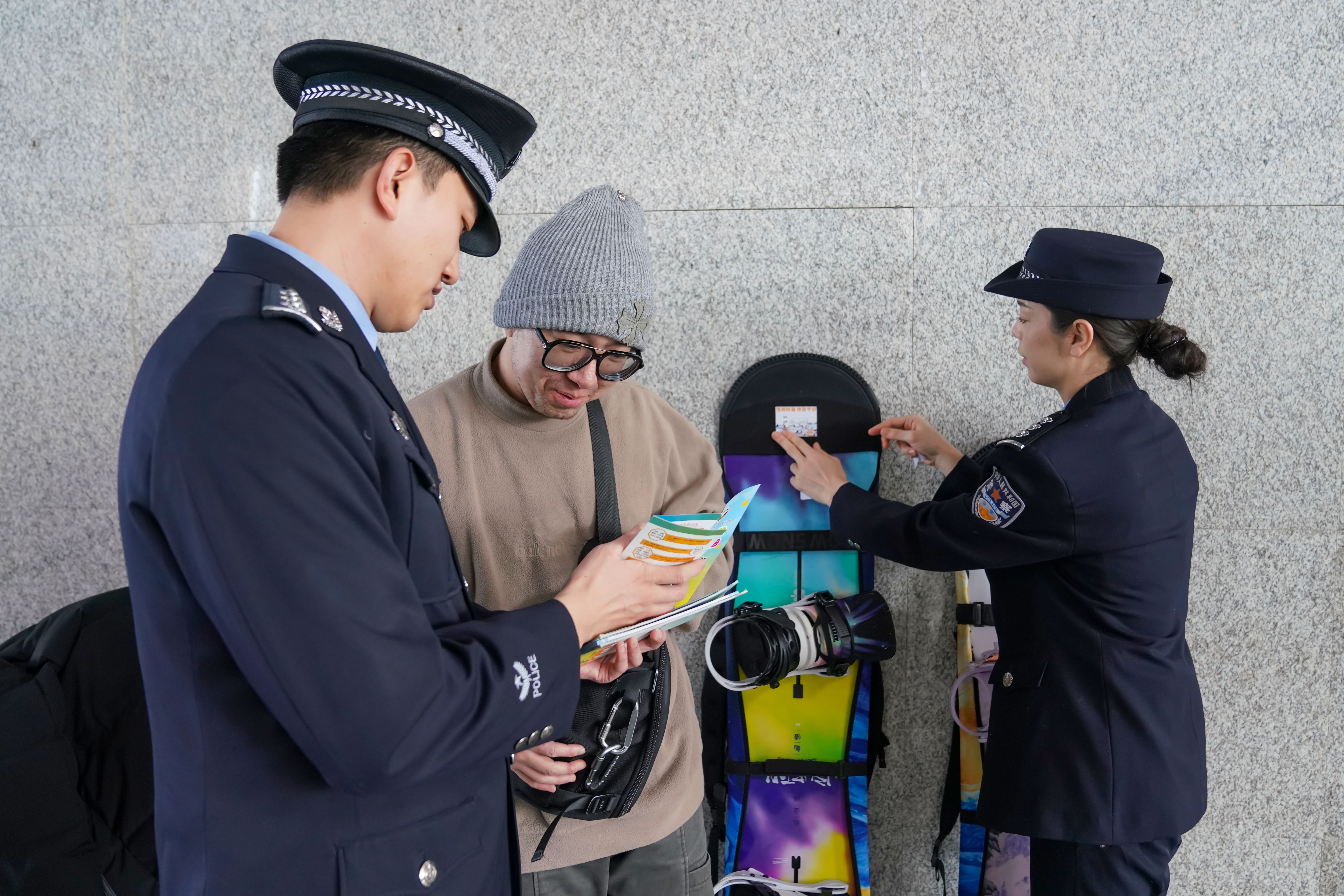民警为旅客讲解出行安全提示,并在旅客雪具上粘贴安全提示卡警民联系贴。通讯员 张艳军摄
