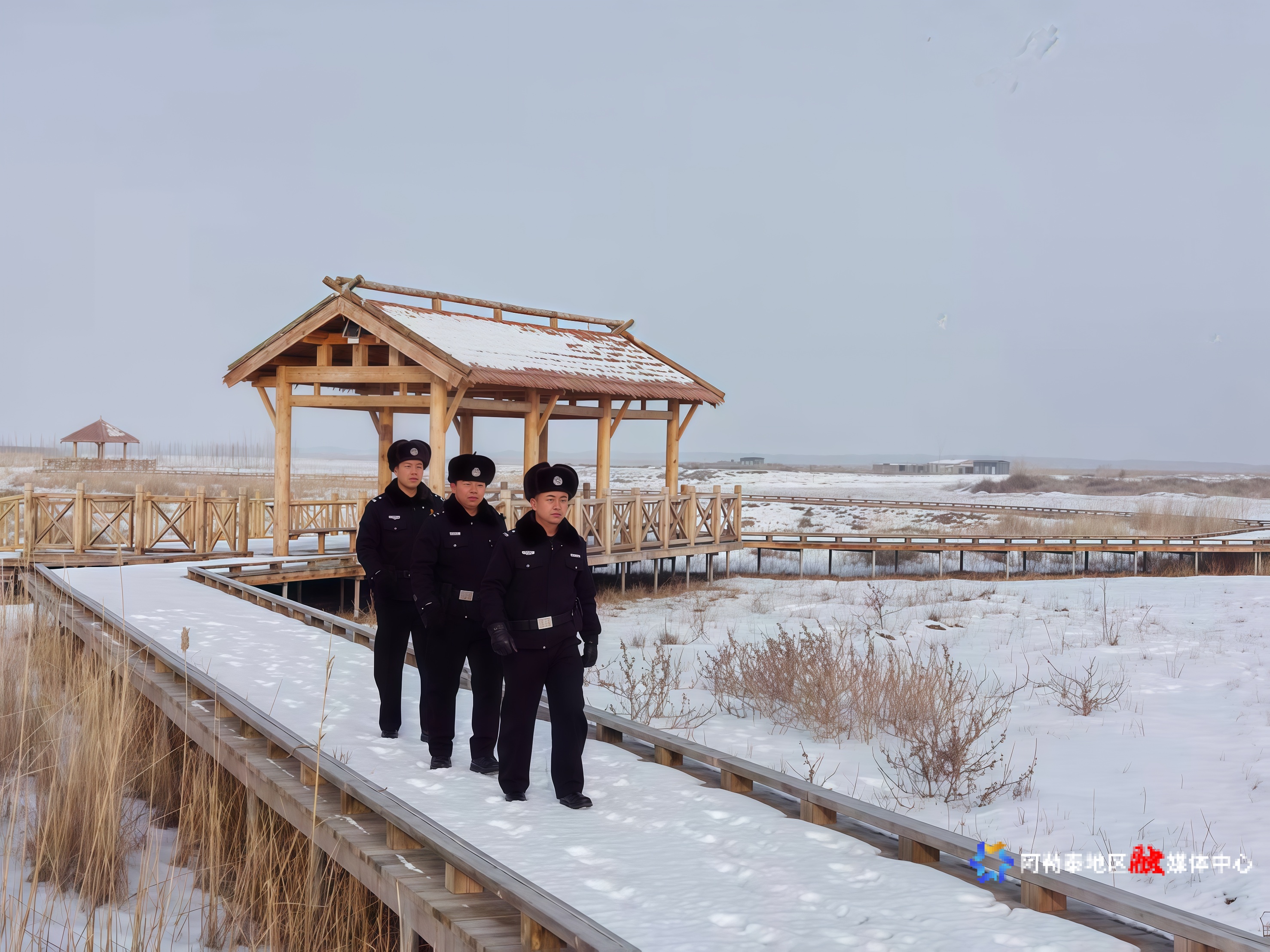 1月25日,阿勒泰市公安局阿拉哈克镇派出所民警在科克苏湿地国家级自然保护区开展步巡工作。通讯员 韩宏亮 摄