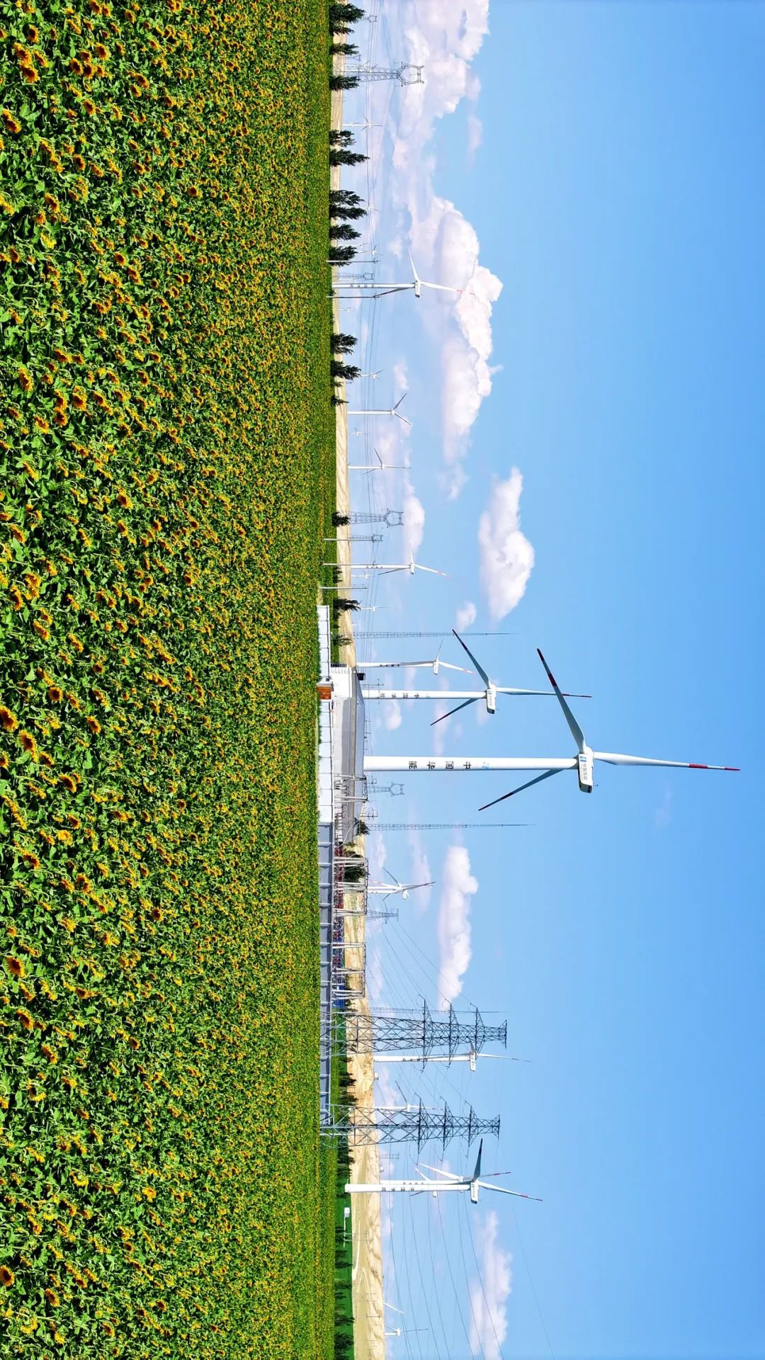 位于阿勒泰地区布尔津县的风电场与向日葵花海。摄影师@努尔别克·努尔曼