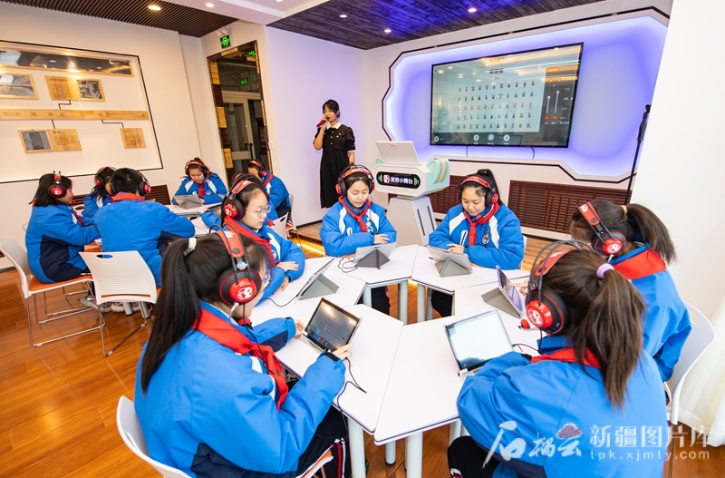 昌吉市“泉昌情·刺桐国学书院”里,昌吉市第二中学学生在有声朗读训练空间朗读古诗词(1月12日摄)。何龙摄