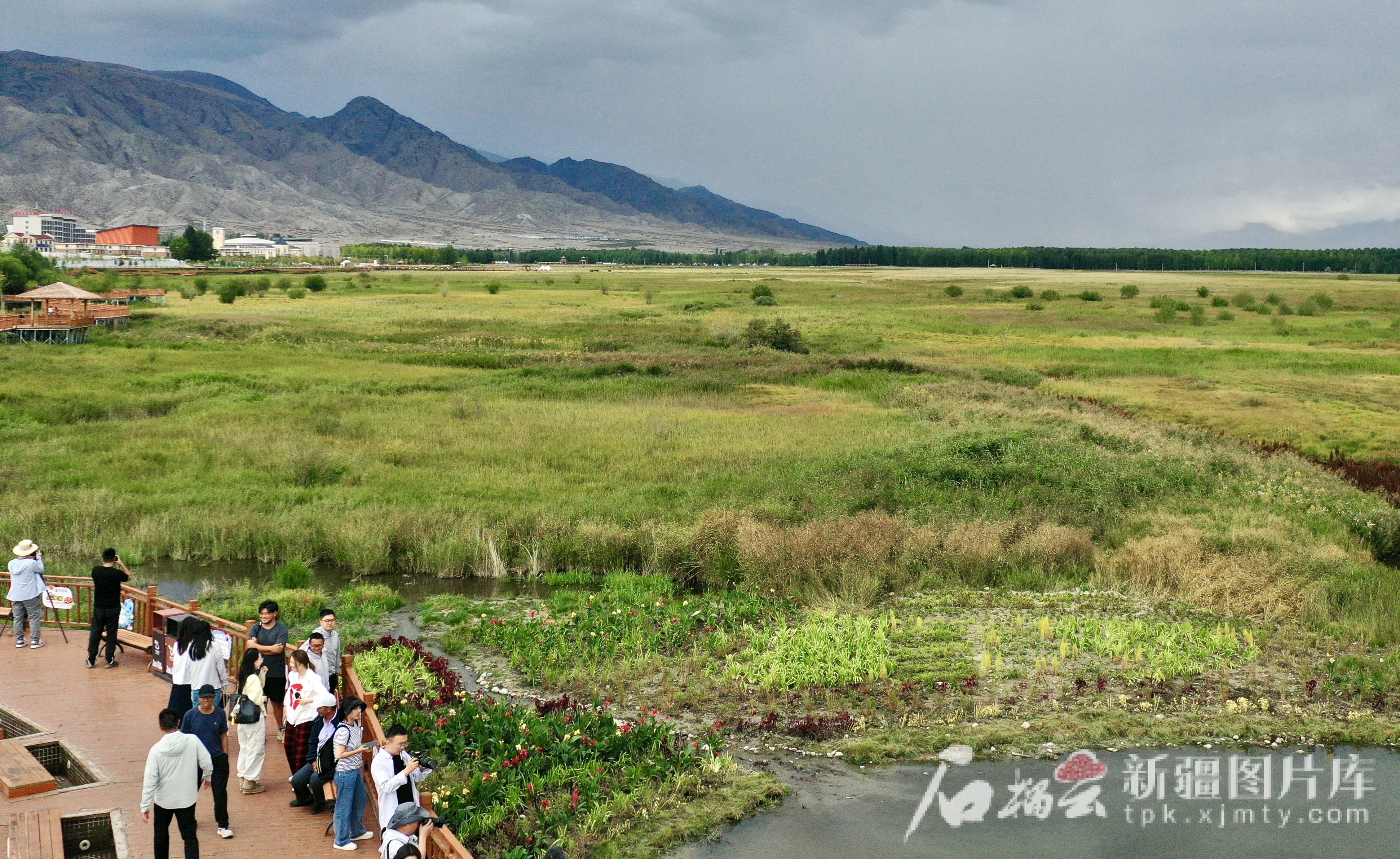 8月15日,温泉县博尔塔拉河国家湿地公园,游客在这里欣赏美景。