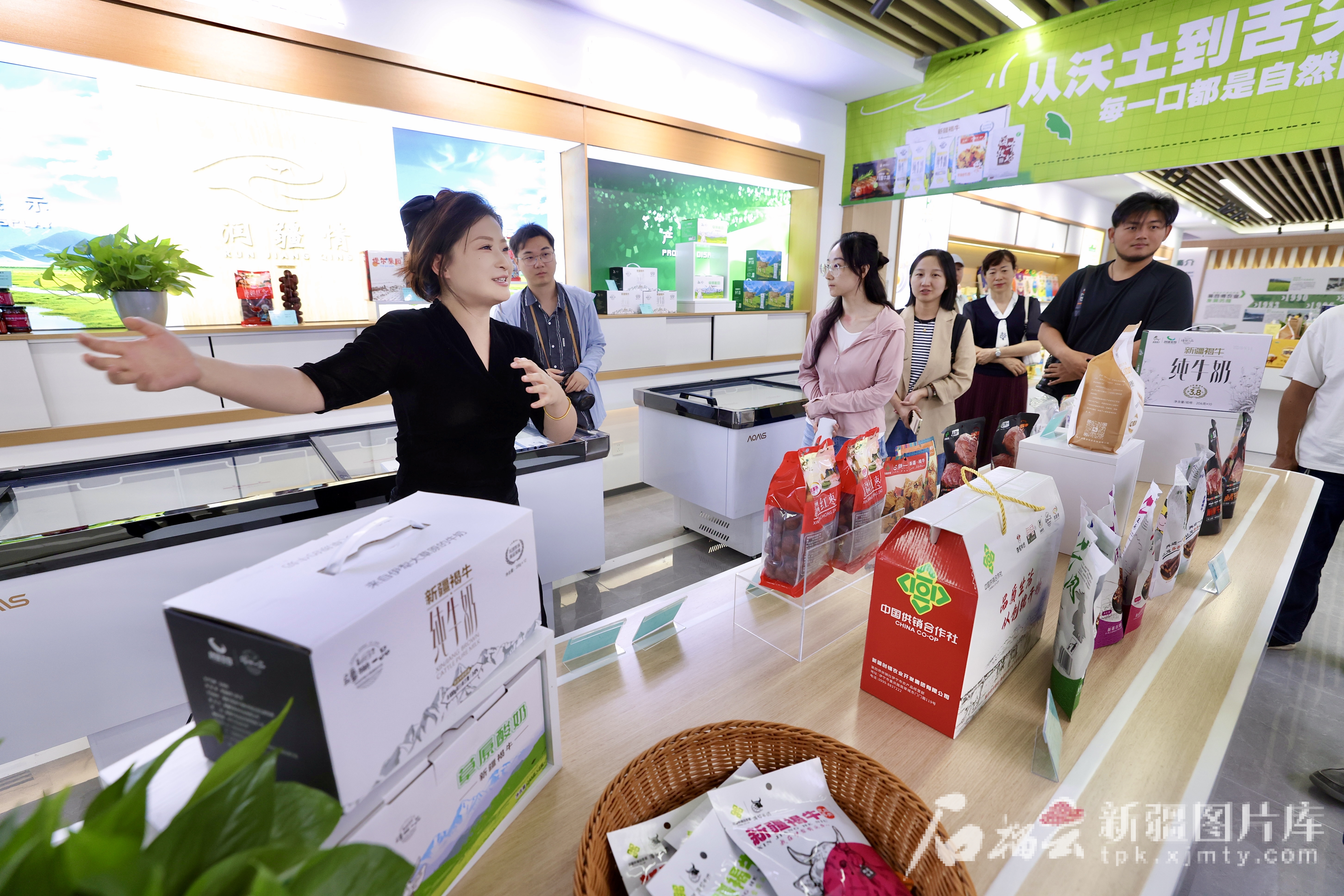 石榴云/新疆日报讯(记者 李瑞 摄影报道)8月17日,“对口援疆 潮涌天山”主题采访活动成员来到兵团第四师可克达拉市。当天,记者走进镇江援疆重点品牌项目——“润疆情”农特产品集中采购仓看到优质大米、鲜美牛羊肉、干果有序陈列在展示柜上,一旁还有试吃装的牛肉干、牛奶等,吸引了不少游客前来选购。