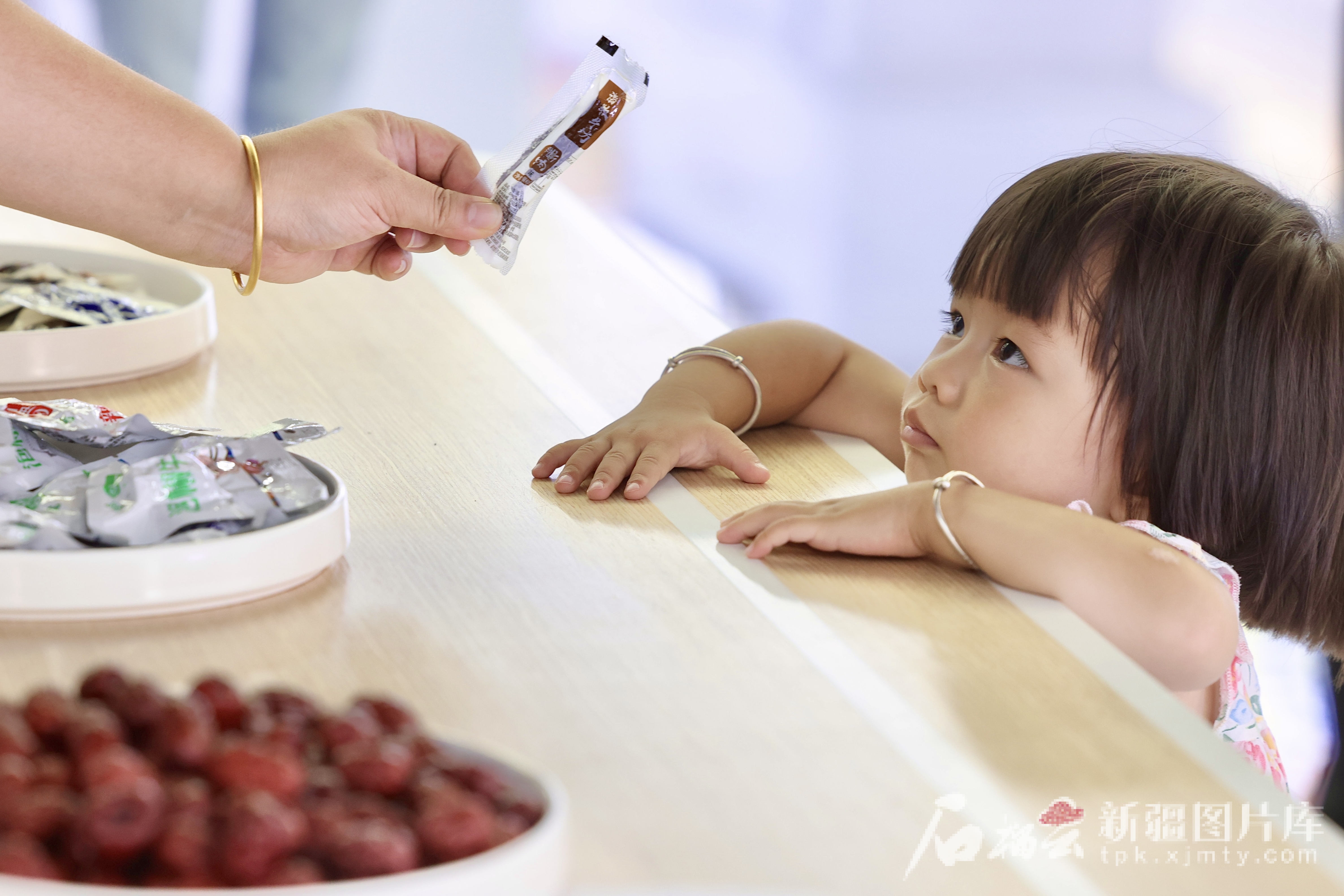 8月17日,小朋友正在“润疆情”农特产品集中采购仓品尝牛肉干。