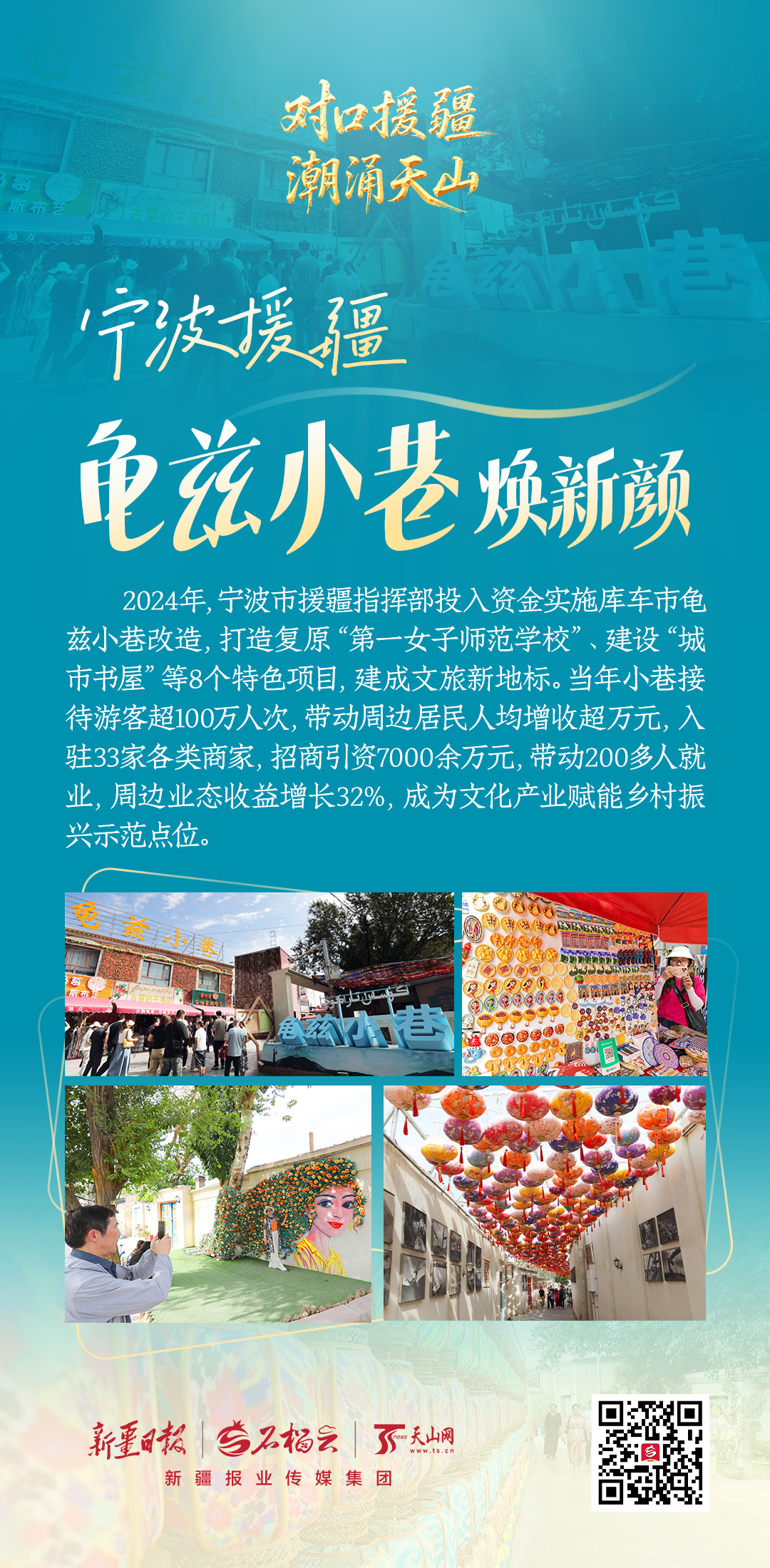 2024年,宁波市援疆指挥部投入资金实施库车市龟兹小巷改造,打造复原“第一女子师范学校”、建设“城市书屋” 等8个特色项目,建成文旅新地标。当年小巷接待游客超100万人次,带动周边居民人均增收超万元,入驻33家各类商家,招商引资7000余万元,带动200多人就业,周边业态收益增长32%,成为文化产业赋能乡村振兴示范点位。