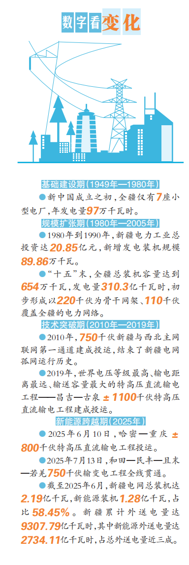 从全疆仅有7座小型电厂,到新能源汽车充电桩前的便捷扫码;从“人拉肩扛”架设35千伏线路的艰辛,到750千伏环网如巨龙环伺天山的壮阔……70年间,新疆电力不仅实现了从“用上电”到“用好电”的蜕变,更完成了从火电为主到绿电占比大幅提升的跨越,不仅点亮了天山南北的万家灯火,更织就了纵横交错的能源动脉,将清洁电力输送至全国。