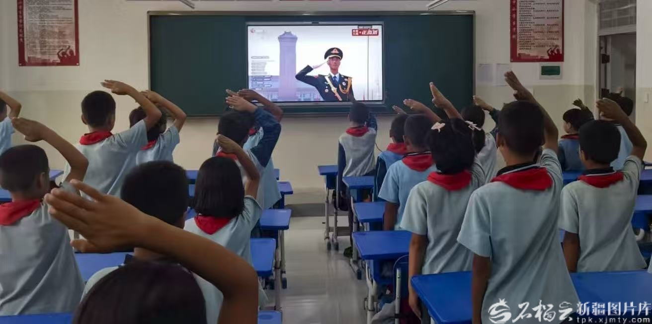 9月3日上午,乌什县依麻木镇国通语学校三年级1班的同学们在收看纪念中国人民抗日战争暨世界反法西斯战争胜利80周年大会直播。刘志杰摄