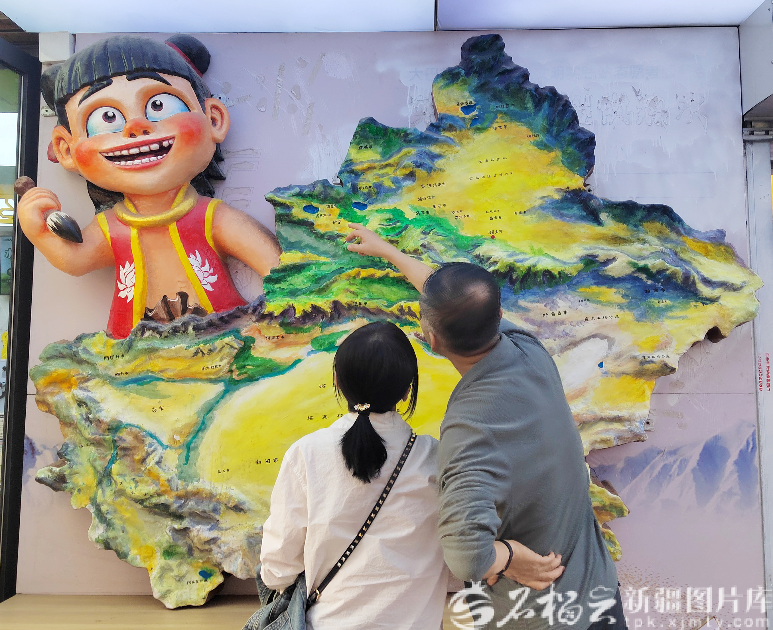 9月8日,游客在新疆国际大巴扎步行街中国邮政大巴扎主题邮局查看新疆地形图。