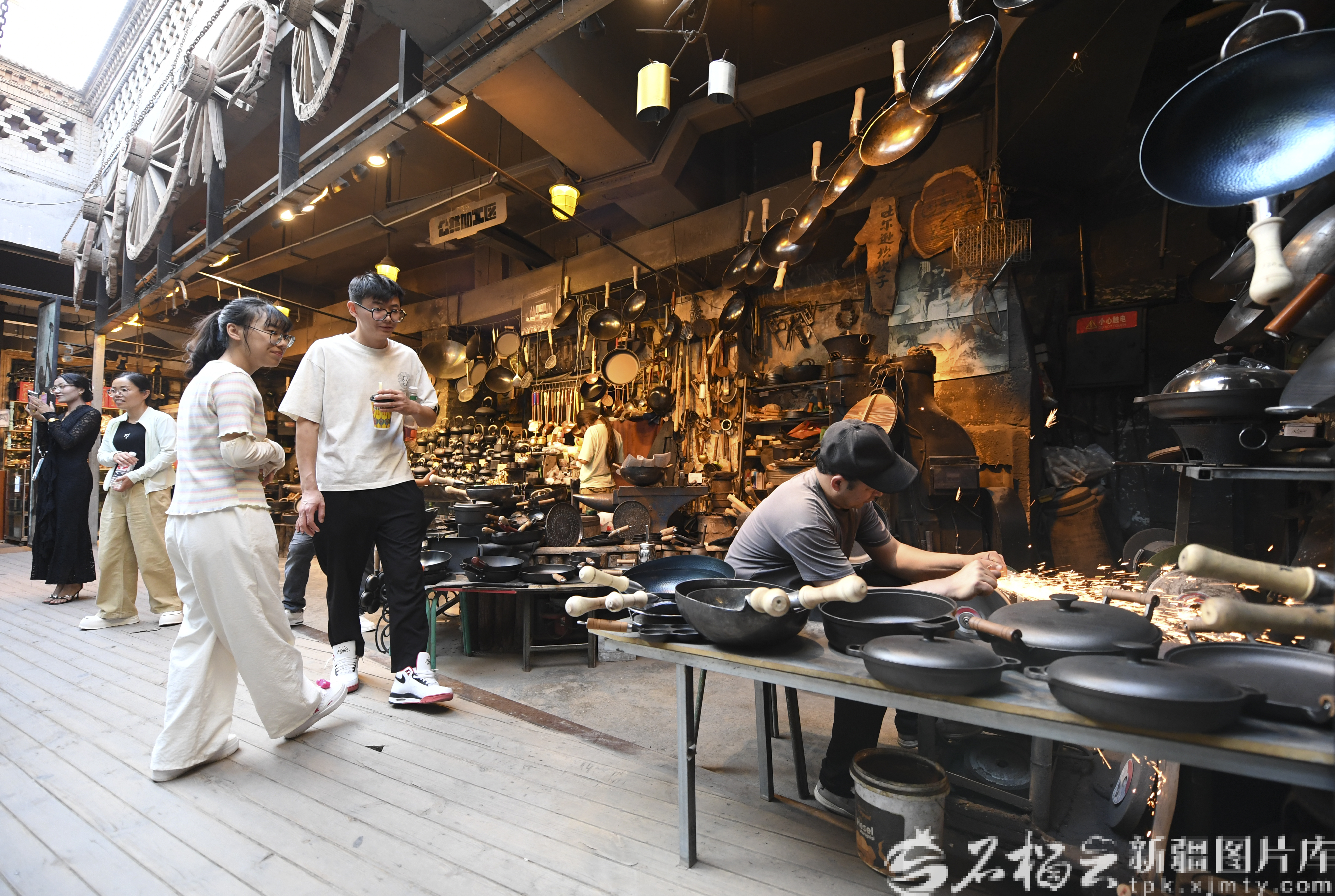 9月10日,游客在参观坎土曼巴扎铁业公社。