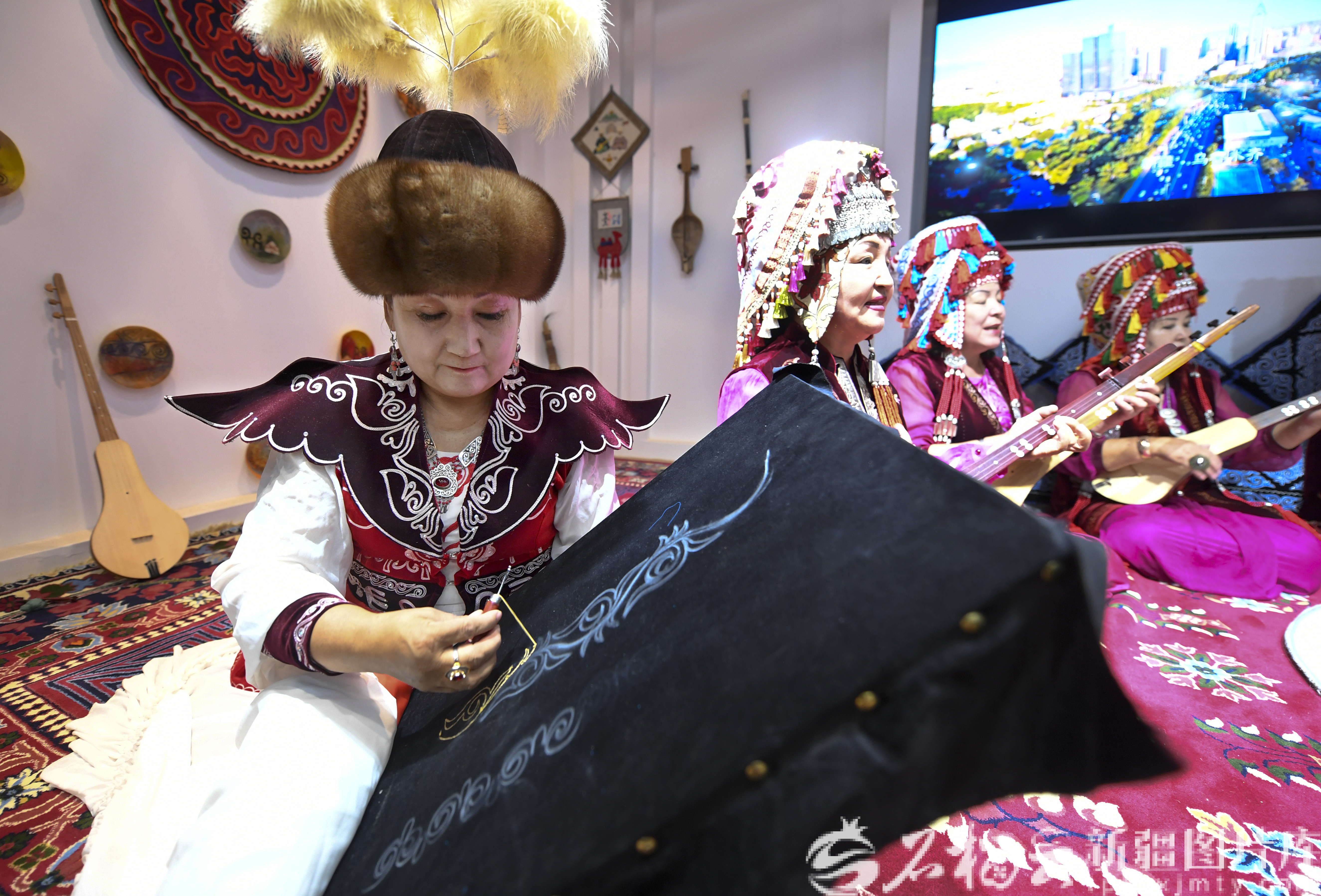 9月12日,民间艺人为参观者弹唱《玛纳斯》。