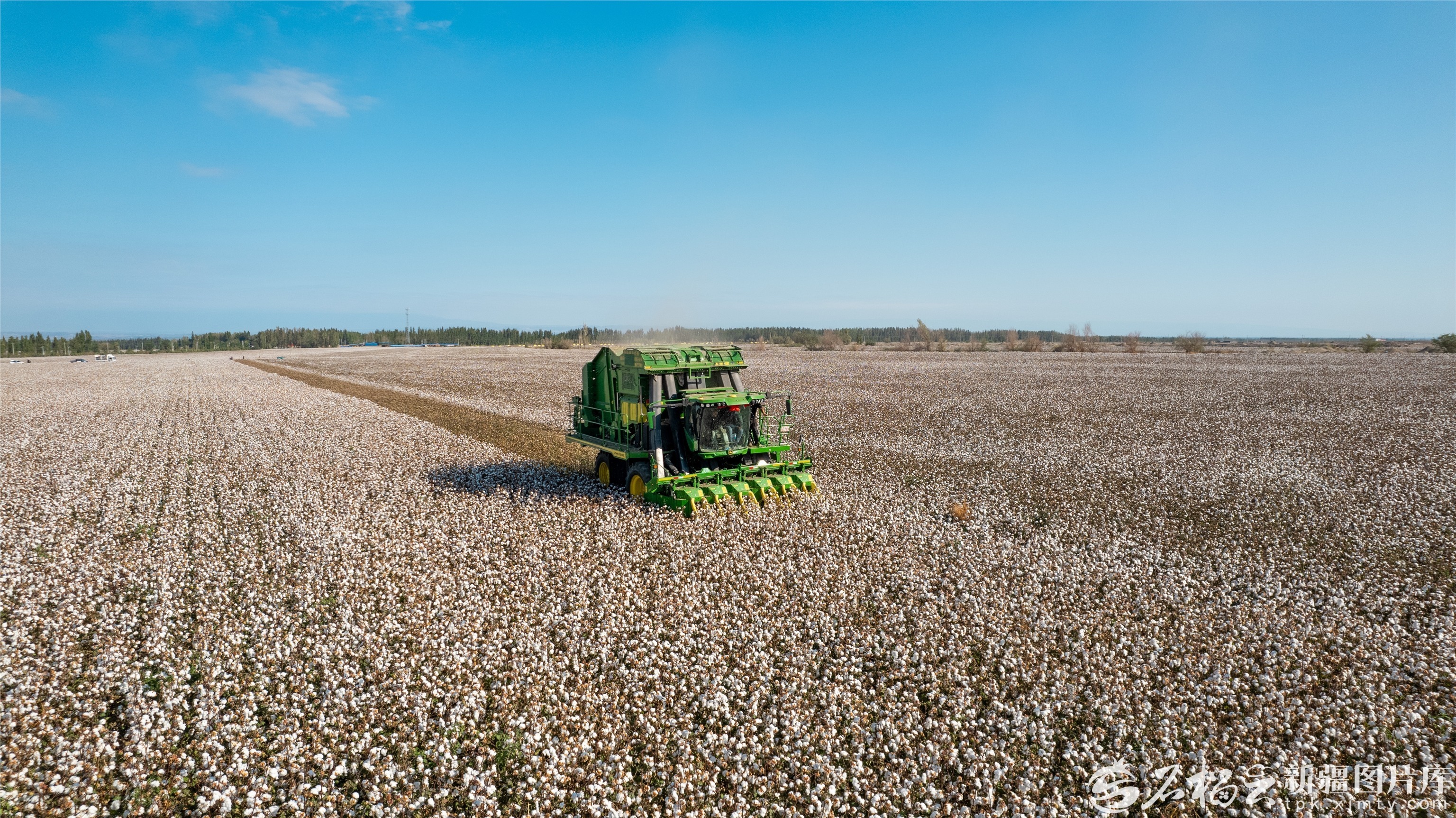 9月15日,大型采棉机在精河县大河沿子镇呼和哈夏南村棉田地采收棉花。 赛永杰摄