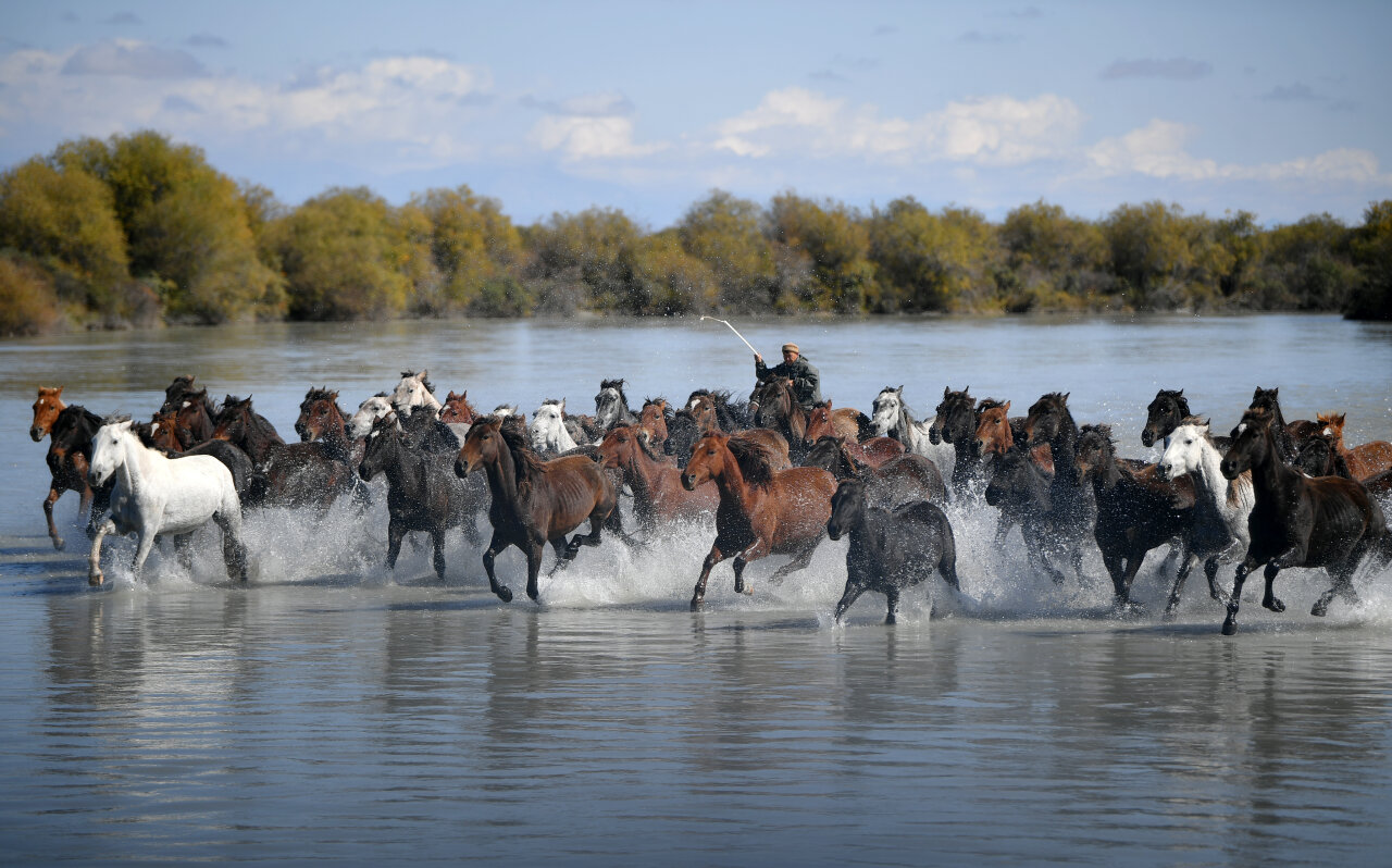 9月20日,昭苏县湿地公园景区上演“天马浴河”。