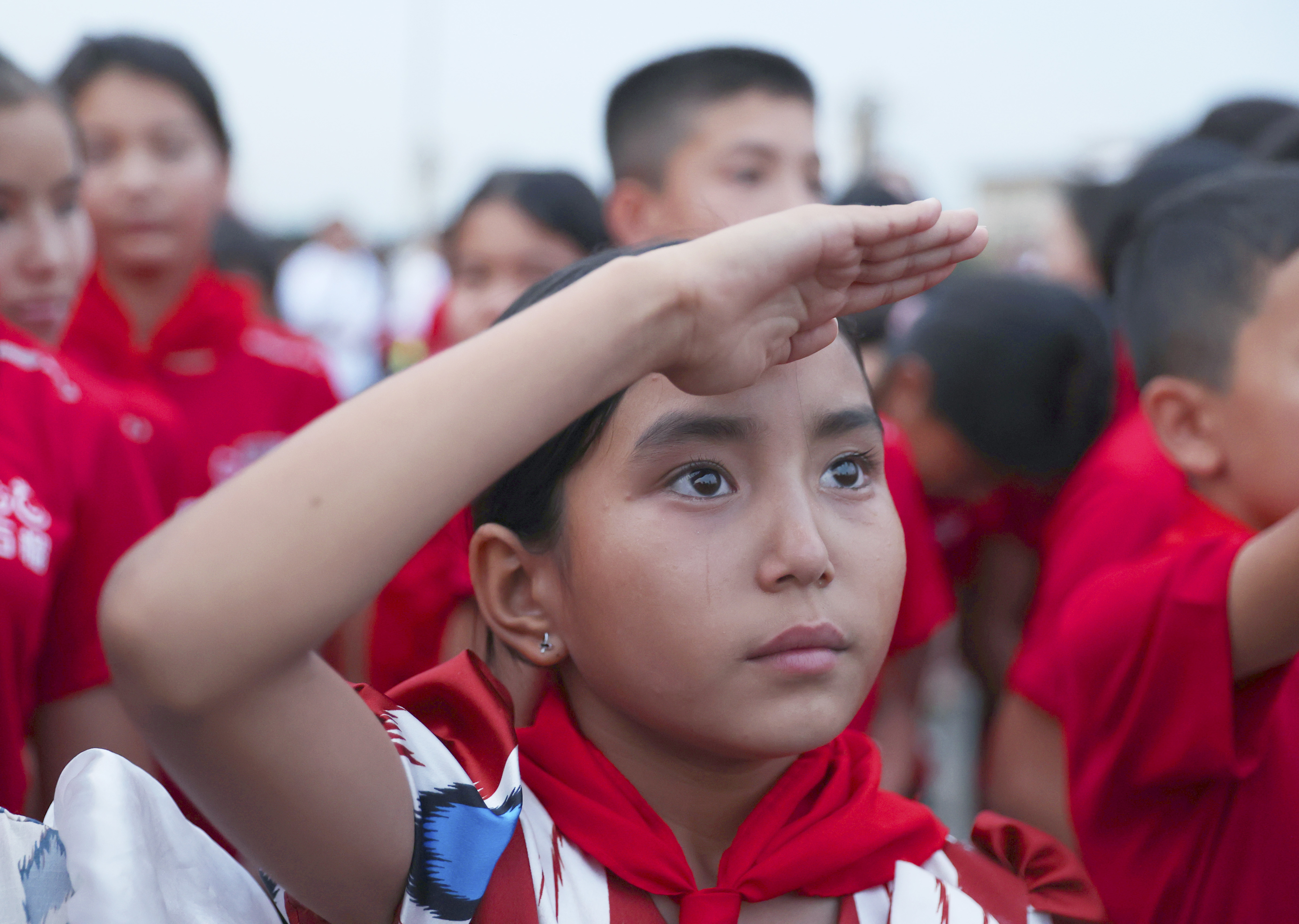 7月31日,策勒县策勒镇中心小学学生帕提曼罕·排日海提第一次在天安门广场观看升国旗仪式。当国旗升起,她抑制不住内心的激动,眼泪夺眶而出。新华社发(张利民摄)