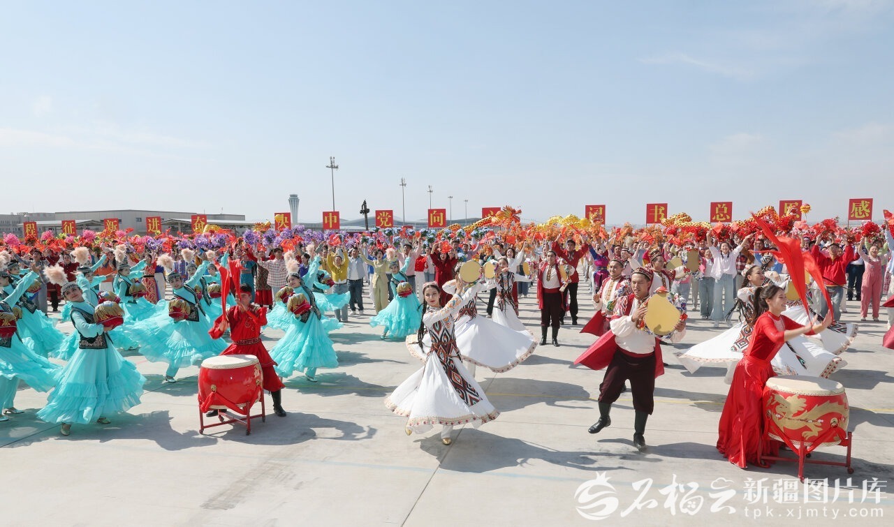 自治区各族群众代表身着节日盛装,挥动红旗和五彩花束,跳起欢快的民族舞蹈,欢迎总书记的到来,表达对总书记的衷心祝福。天山网-新疆日报记者 崔志坚摄