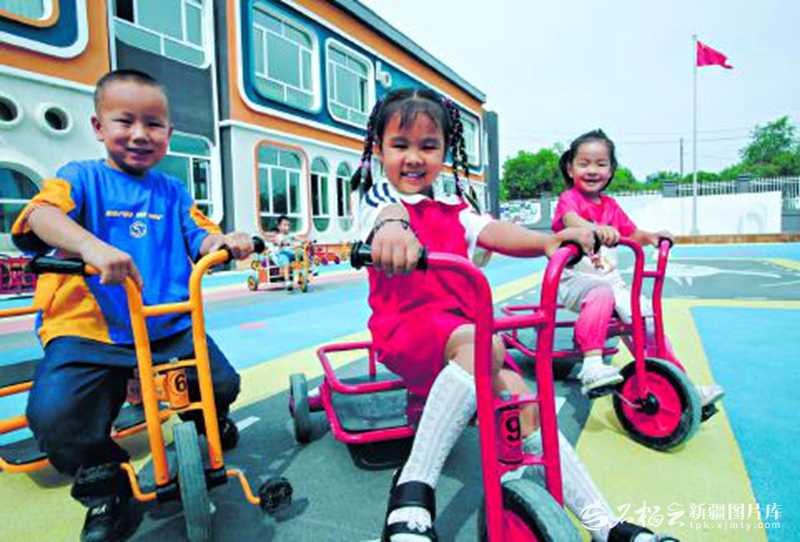 6月25日,裕民县第三幼儿园小朋友在游乐场骑车玩耍。该幼儿园拥有智能教学设备、足球场以及小剧院等,全方位保障幼儿的多元发展。天山网-新疆日报记者蔡増乐摄