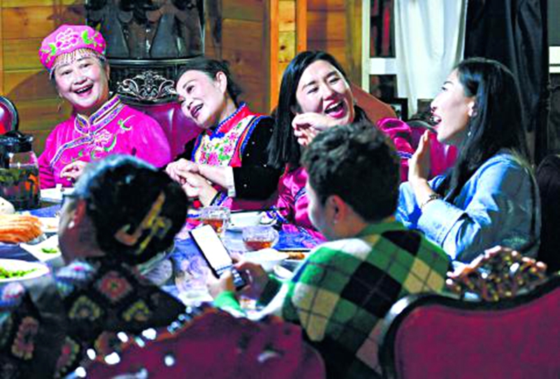 9月17日,锡伯族客人春英(左一)在马秀花家的农家乐里与朋友一起唱歌。马秀花是塔城人,家里的农家乐每天招呼着各地往来的朋友。新华社记者王菲摄