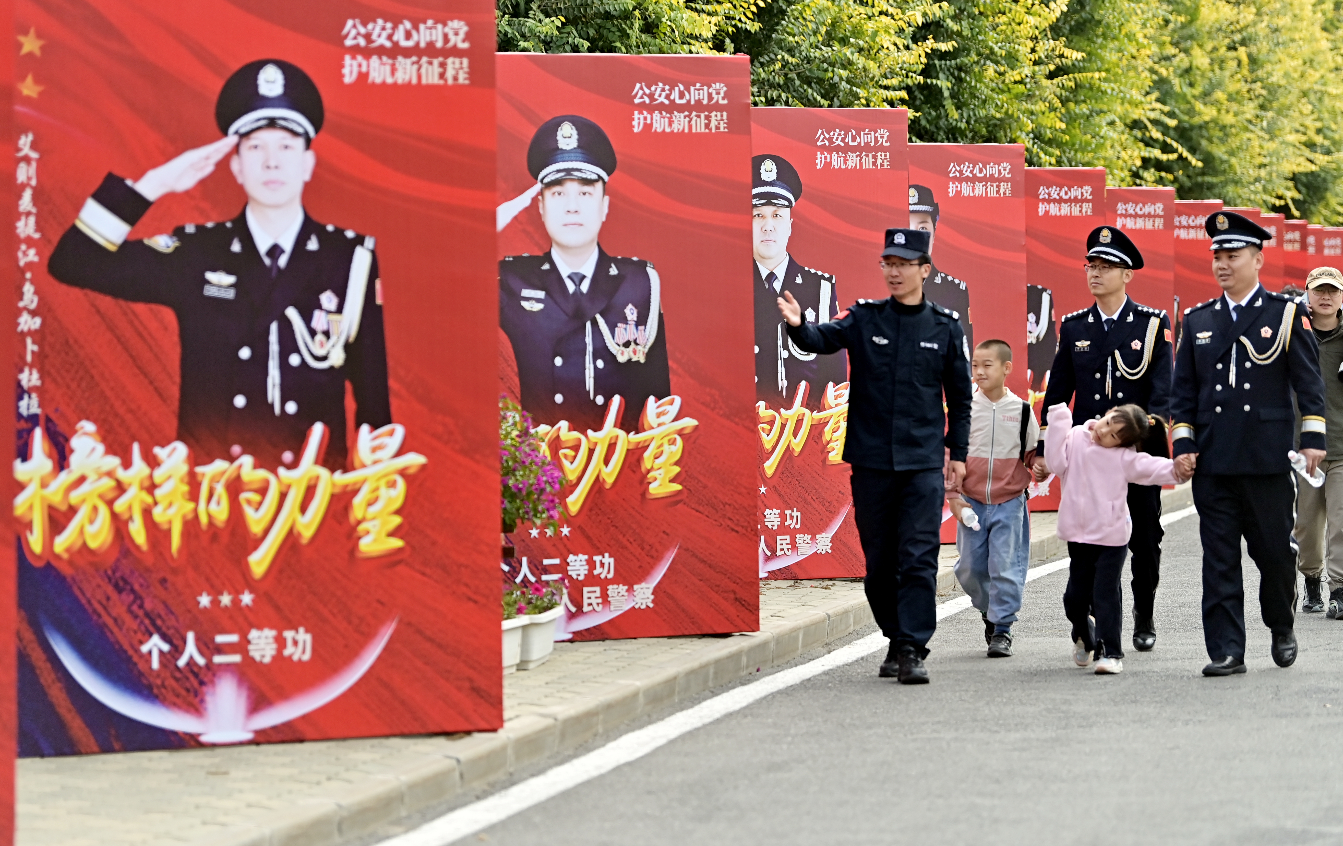 2024年10月4日,乌鲁木齐市公安局在特警重大活动安保支队(原特警七支队)举办警营开放日活动。民警给孩子介绍英模故事。 石榴云/新疆法治报记者 单坤摄