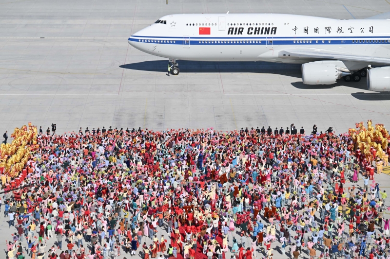 23日14时20分许,习近平总书记乘坐的专机在天山国际机场降落。总书记走下舷梯,向欢迎群众挥手致意。霎时,所有人的热情已同欢快的旋律一道飞扬起来:“我们新疆好地方,天山南北好牧场……”
