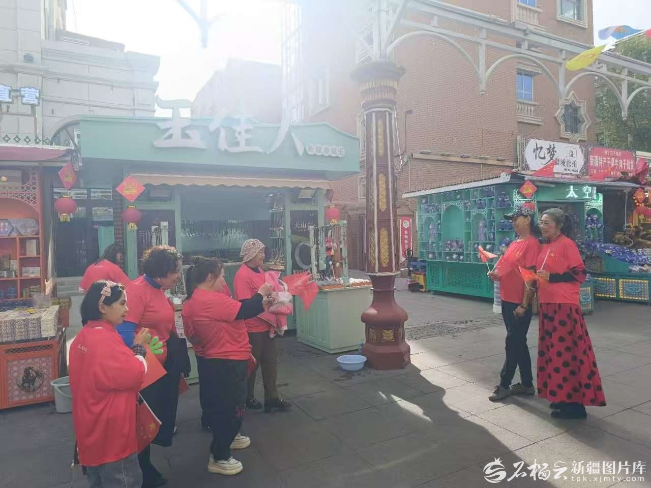 在步行街,人潮涌动,随处可以看到手里挥动着国旗的游客、市民。来自四川的大学生张昊然和同伴们原本正在挑选手鼓,忽然身边有人齐唱《我和我的祖国》——原来是大巴扎步行街举行的“我把新疆唱给你听”快闪活动。他们随即加入合唱的队伍,“在‘歌舞之乡’唱这首歌,感觉每个音符都带着葡萄干的甜蜜!”张昊然说,在新疆旅游,最让他们感动的就是新疆的团结氛围,“互不相识的游客、当地人在一起,挥动国旗齐声高歌的场景,太感人了!”