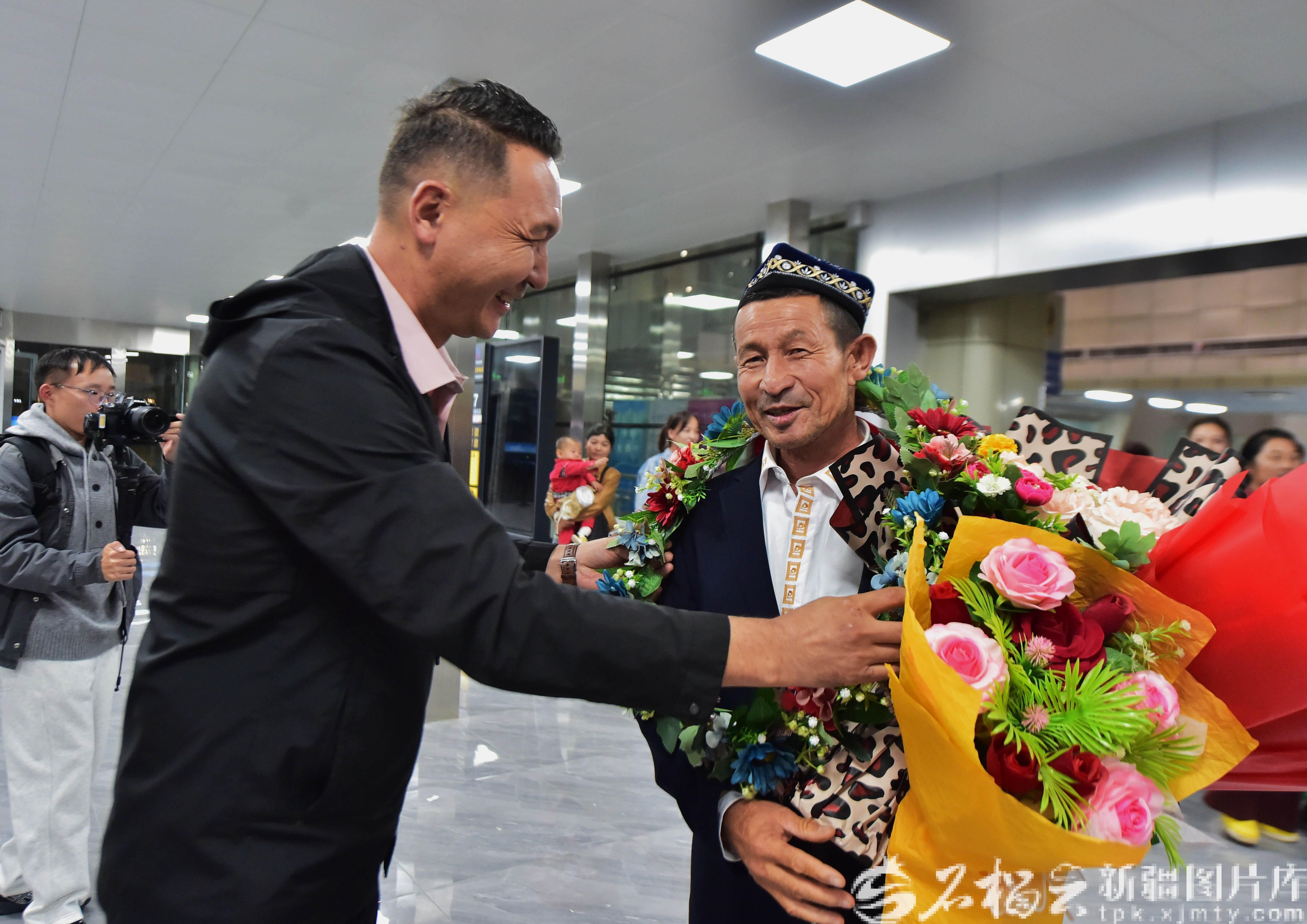 10月1日,在库尔勒梨城机场,乡亲们为阿力甫·买买提送上鲜花。