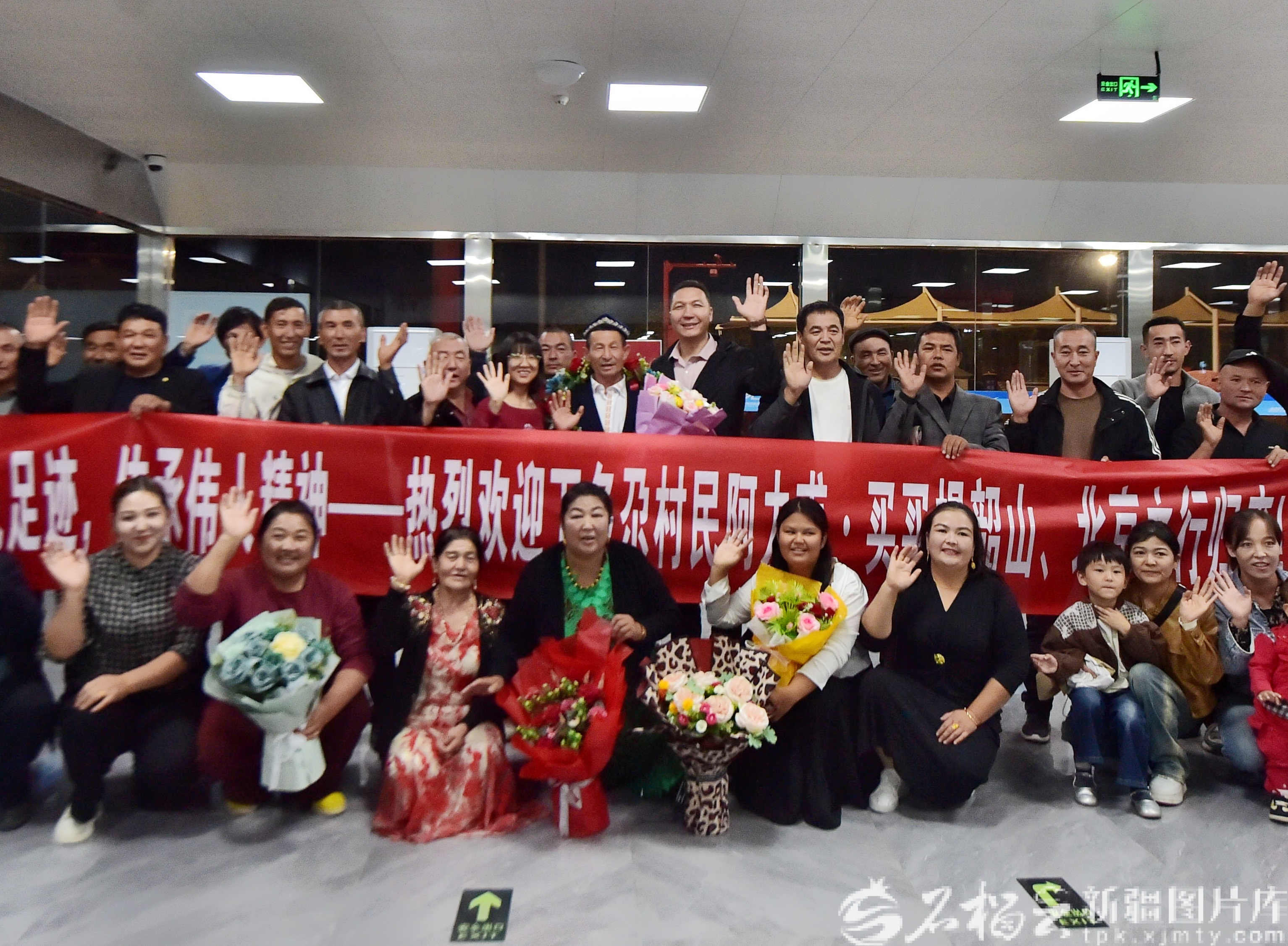 10月1日晚,阿力甫·买买提在机场和乡亲们合影。