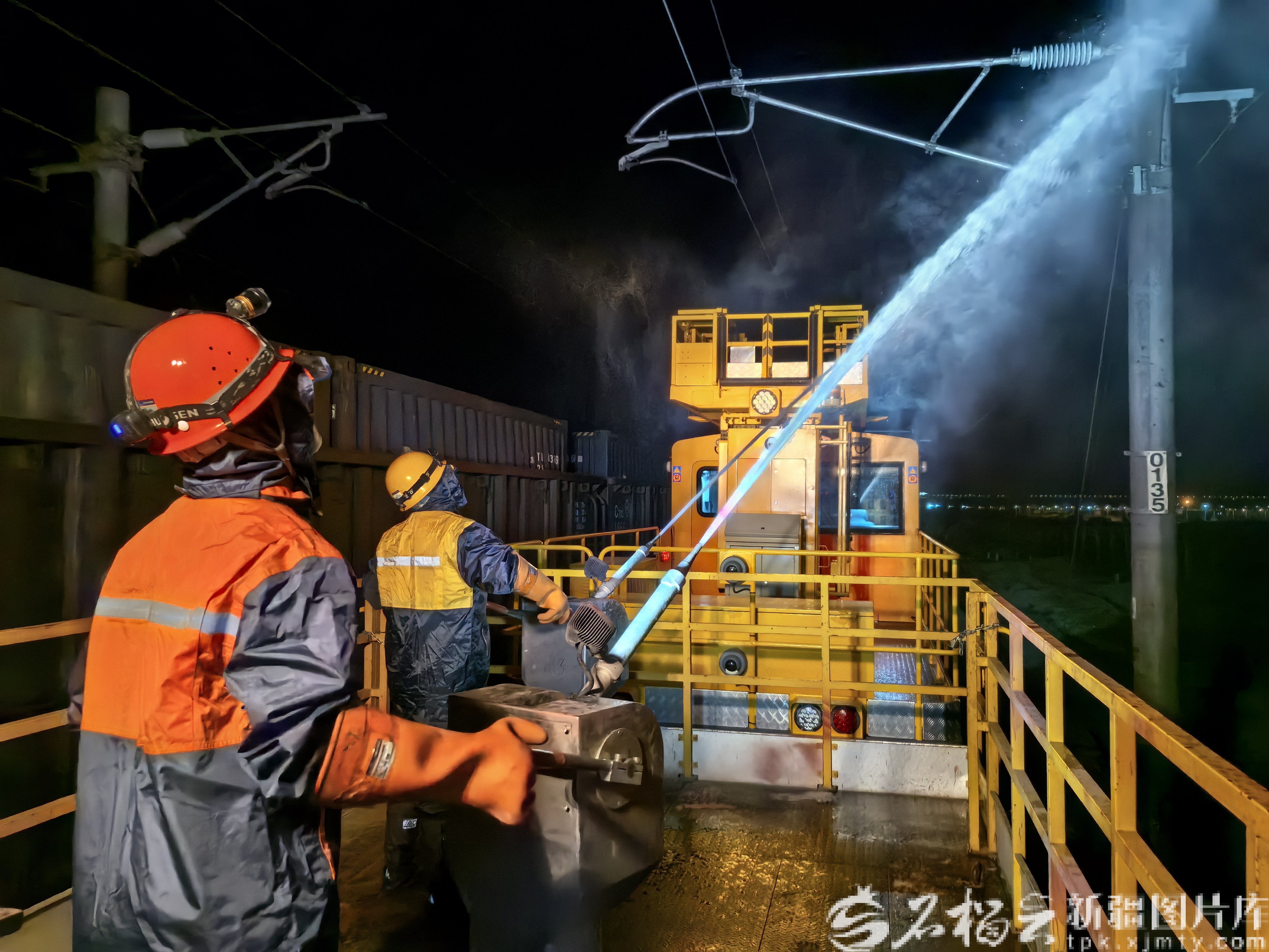 10月1日22时,乌将铁路准东车站灯火通明。此时,乌鲁木齐供电段准东供电车间的作业人员已经集结完毕,邸得帅和同事们登上清洗作业列车开展清洗作业。