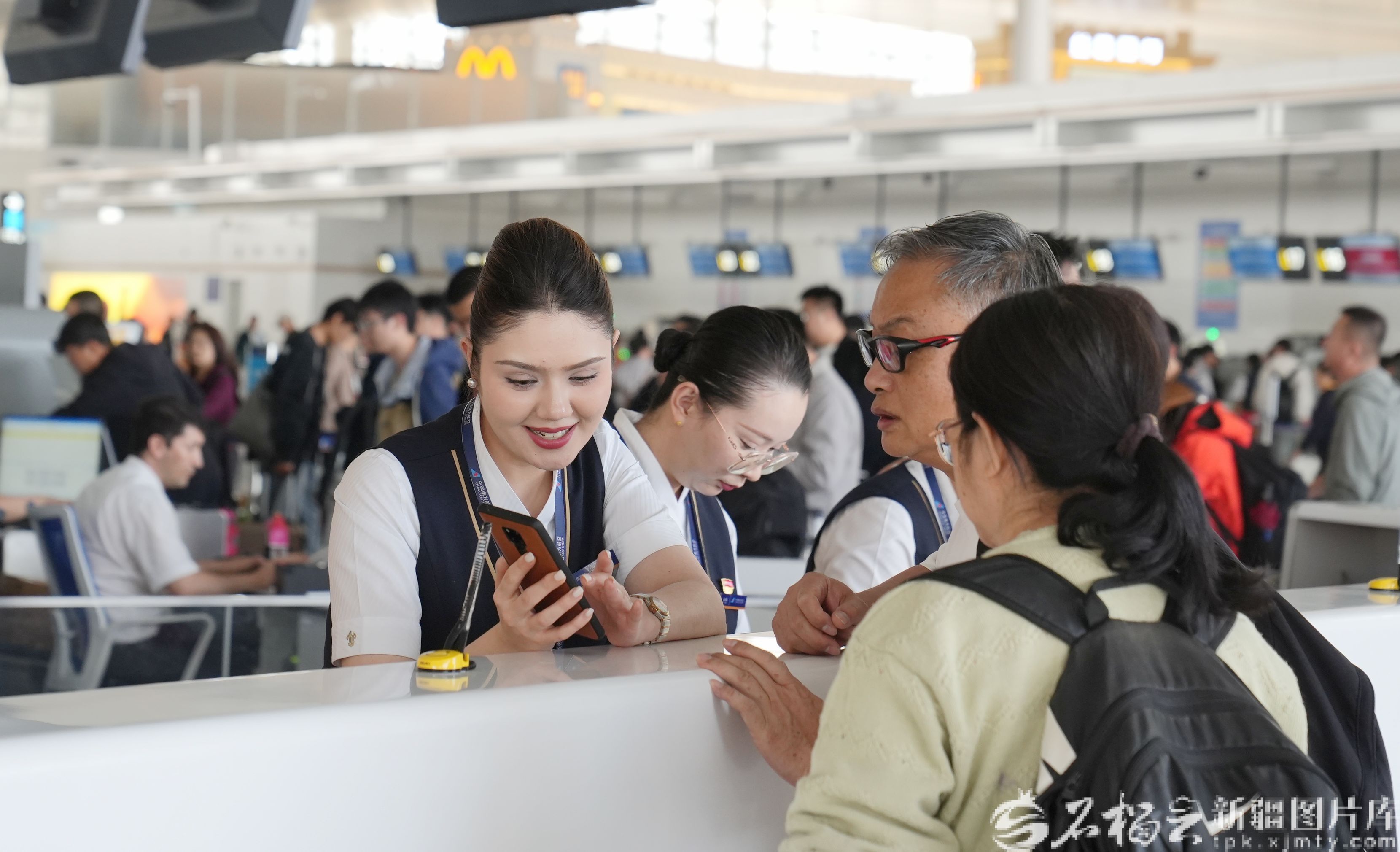 10月1日,乌鲁木齐天山国际机场内,工作人员为旅客办理出行手续。王萍 摄