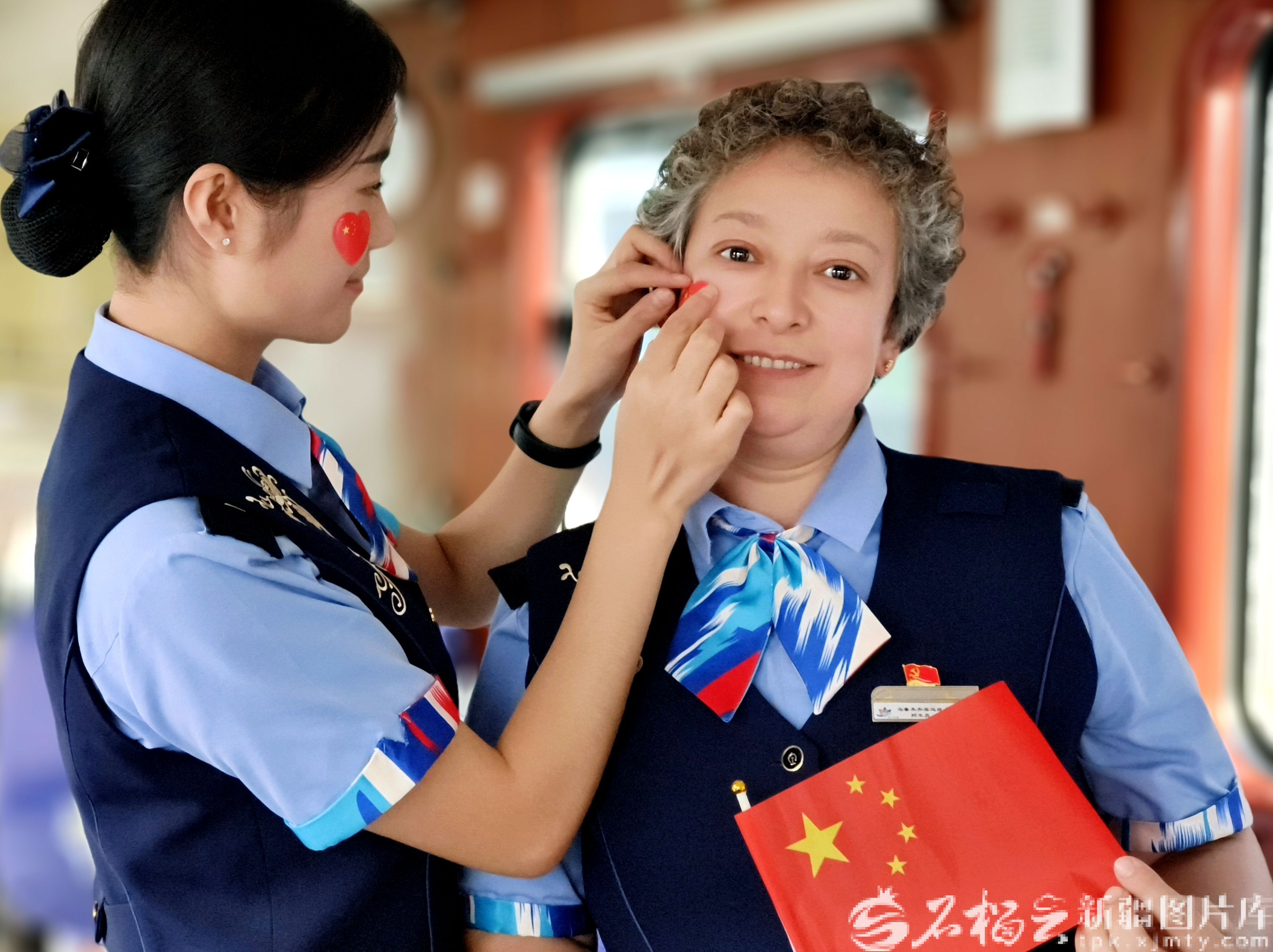 10月1日,在武昌开往乌鲁木齐的Z293次列车上,工作人员为彼此贴上国旗脸贴,祝福祖国。高亚丽 摄