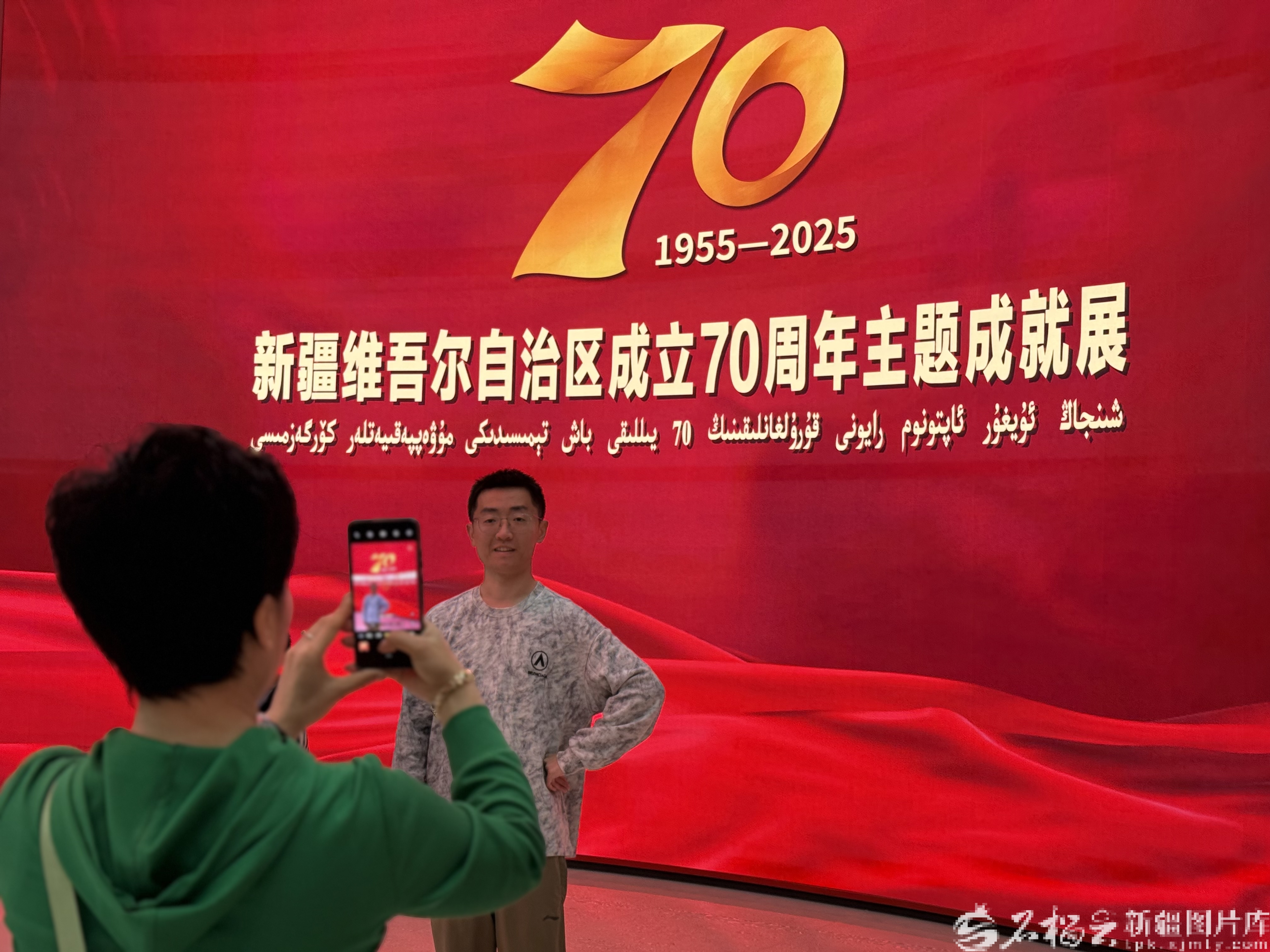 天山网-新疆日报讯(记者孙芳婷报道)当进入新疆维吾尔自治区成立70周年主题成就展时,池亚光被眼前巨大的红色荧幕瞬间击中,几个鎏金大字在灯光下熠熠生辉。“一下子就热血沸腾了!”池亚光激动地对身边的朋友说。