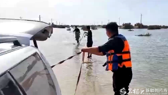 10月1日,尉犁县公安局肖塘派出所救援被困车辆。王东昌摄