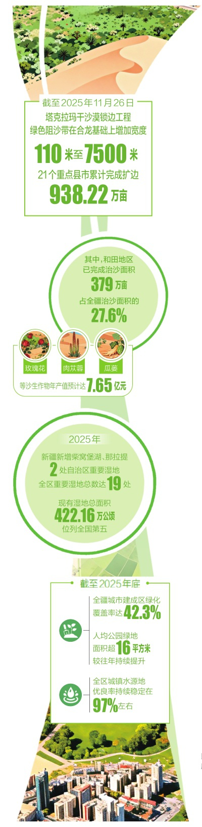 空气质量继续好转,赛里木湖的水越来越蓝,塔克拉玛干的“绿围脖”越织越厚,越来越多的天鹅留在新疆过冬。城市绿地面积持续扩大,绿化品质不断提升,绿色成为城市发展最鲜明的底色……2025年,新疆深入贯彻绿色发展理念,坚持生态优先、绿色发展,统筹山水林田湖草沙一体化保护和系统治理,在天山南北广袤大地上精心描绘出一幅“山青、水绿、林茂、田沃、民富”的美丽画卷。从沙漠到绿洲,从河流到草原,生态保护的成效持续彰显,“绿水青山就是金山银山”的理念在实践中结出丰硕果实。