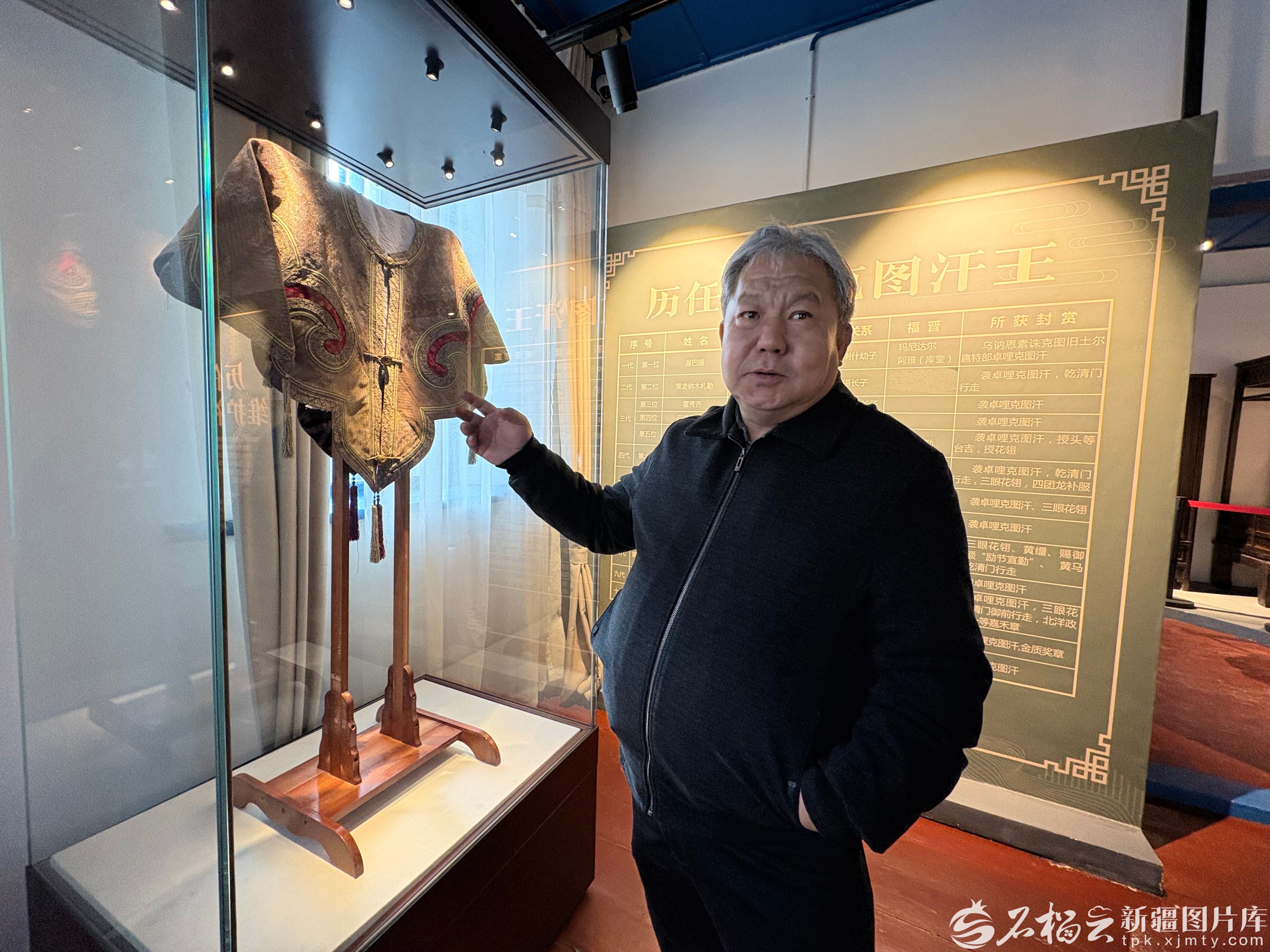 和静县东归博物馆馆长才仁加甫介绍馆内展品。记者 王晶晶摄
