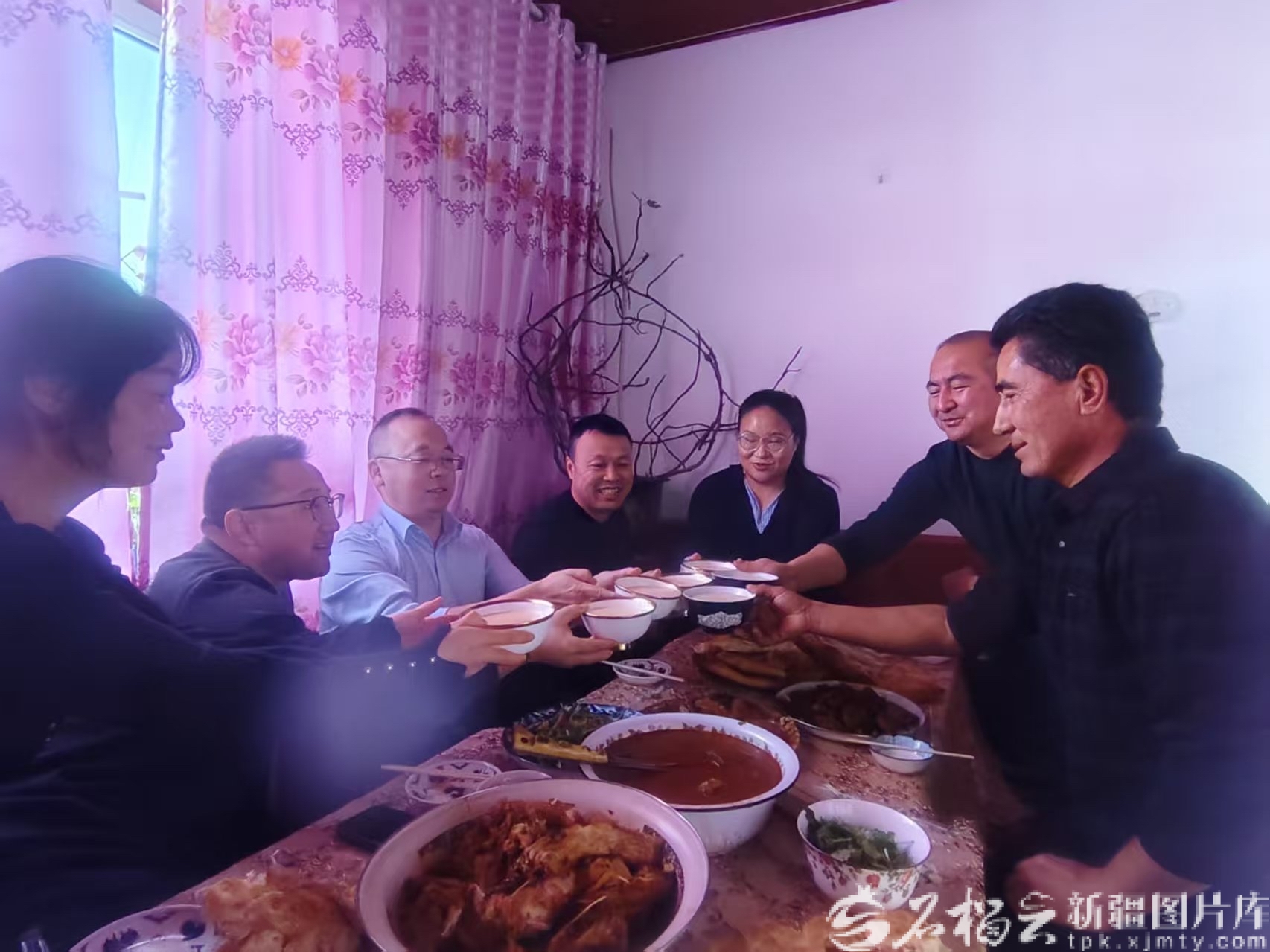 同一时间,察布查尔锡伯自治县琼博拉镇克其克博拉村村民艾米江·托合塔木西的家中也格外热闹,察布查尔锡伯自治县农业农村局办公室干部们正与村民分工协作,择菜、切菜、烹饪有条不紊,鲜美的鱼炖豆腐、喷香的辣子炒鸡、爽口的香干芹菜等菜肴摆满餐桌。