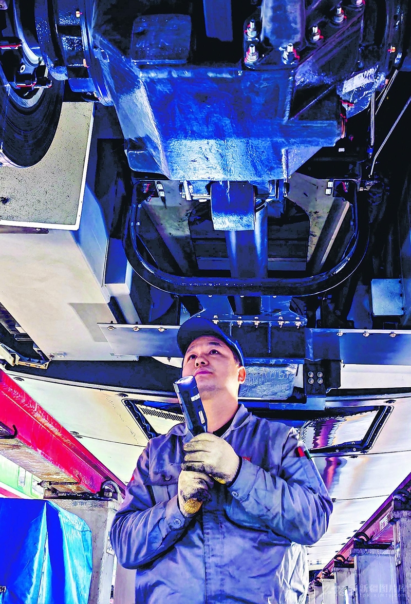 2月4日,中国铁路乌鲁木齐局集团有限公司乌鲁木齐车辆段动车片区,机械师手持多功能手电检查维护返程动车的每一个部件。