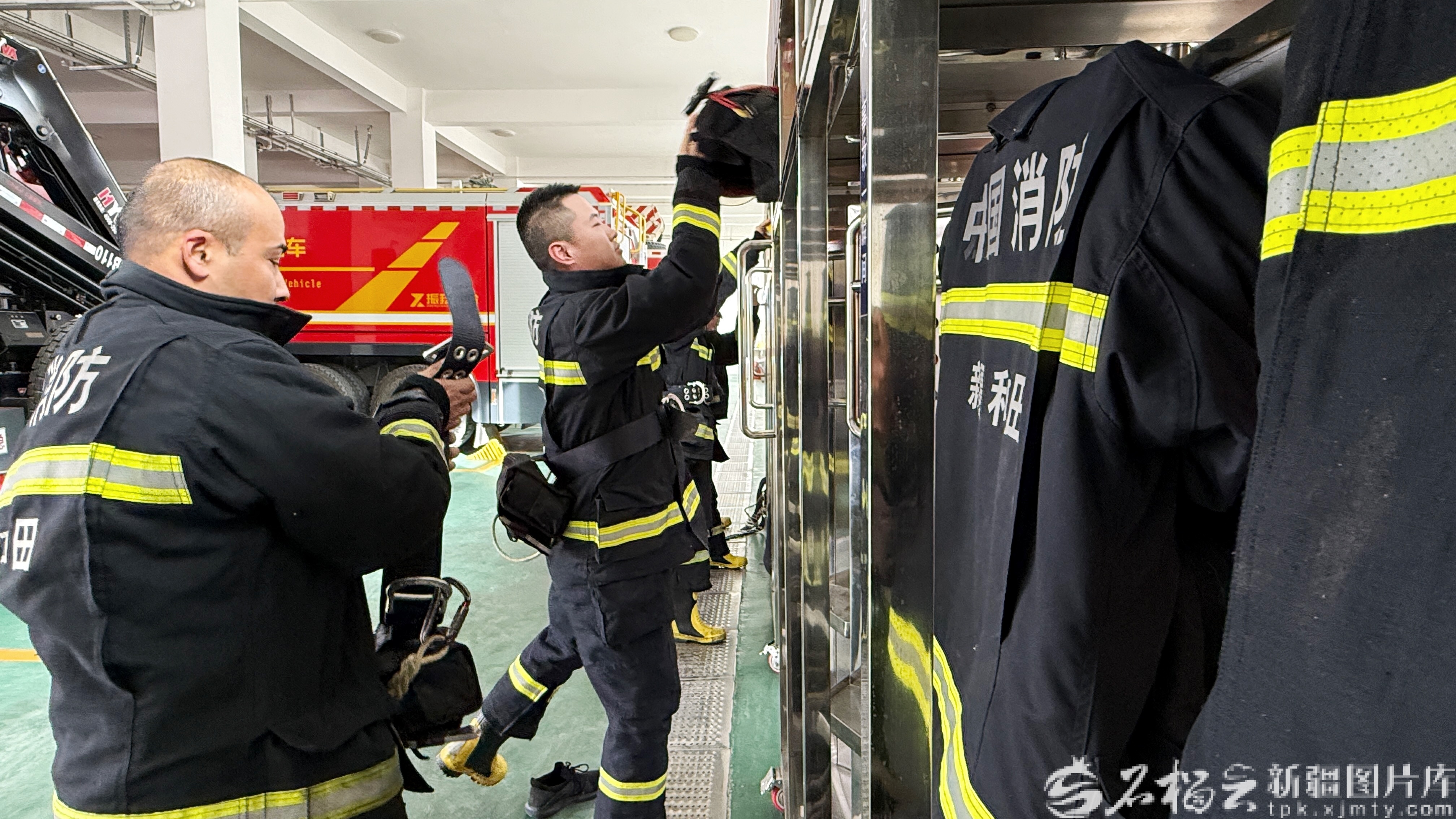 2月12日,在和田市消防救援大队古江北路消防救援站,谭旭东和队员们正开展常规训练。王雪莲 摄