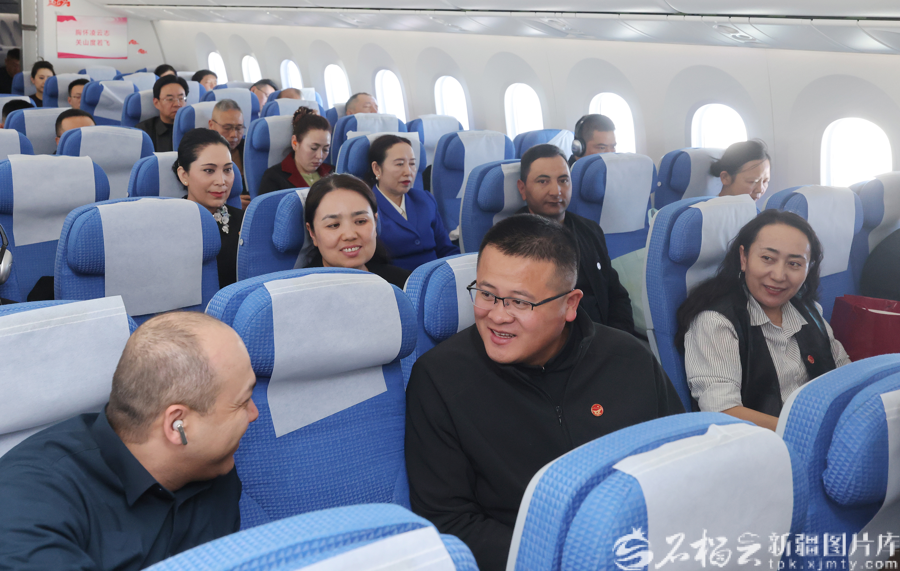3月3日,出席十四届全国人大四次会议的在疆全国人大代表乘机抵达北京。图为在前往北京的飞机上,逄子剑代表(前排中)与木沙·买买提代表(左一)交流。天山网-新疆日报记者 崔志坚摄