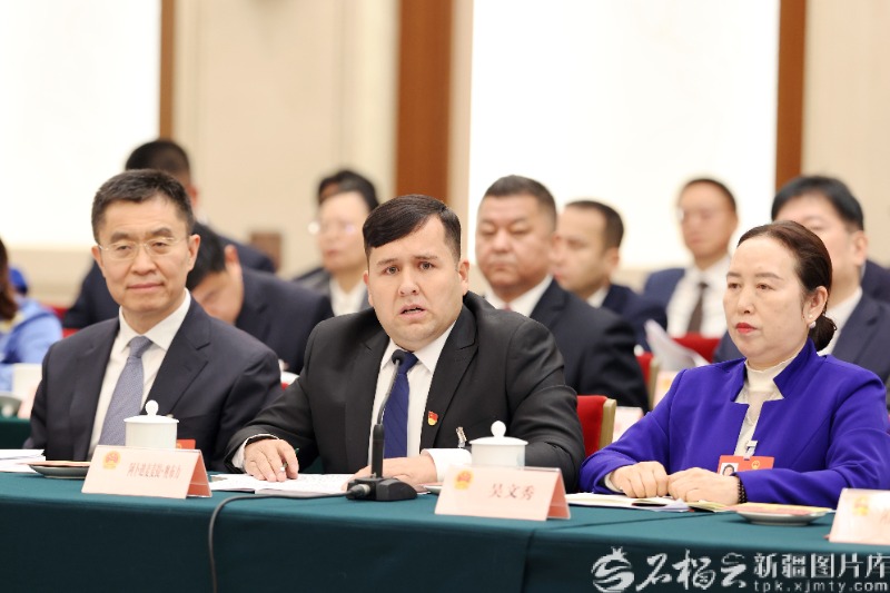 3月6日,参加十四届全国人大四次会议的新疆代表团举行全体会议,审议政府工作报告,审查“十五五”规划纲要草案。阿卜迪麦麦提·奥布力(前中)围绕产业富民、乡村振兴等内容发言。